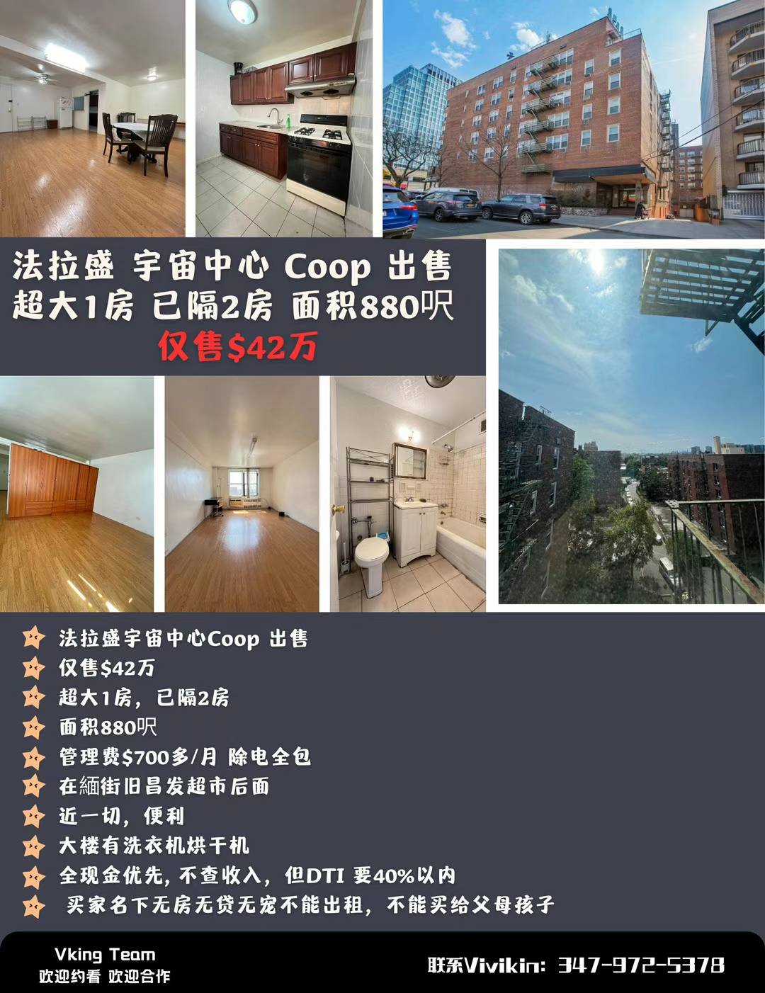 欢迎合作,随时约看Flushing法拉盛公寓出售 Flushing NY Coop for sale新上市