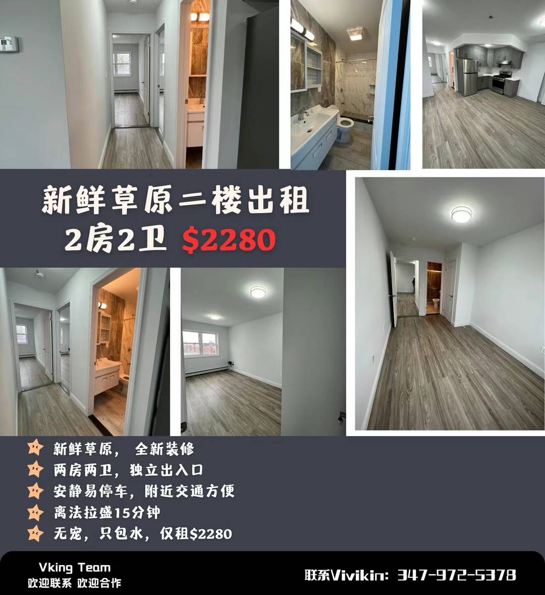 二楼:新鲜草原, 全新装修,两房两卫,独立出入口,安静易停车,附近交通方便,离法拉盛15分钟,无宠,只包水,$2280. 10分初中