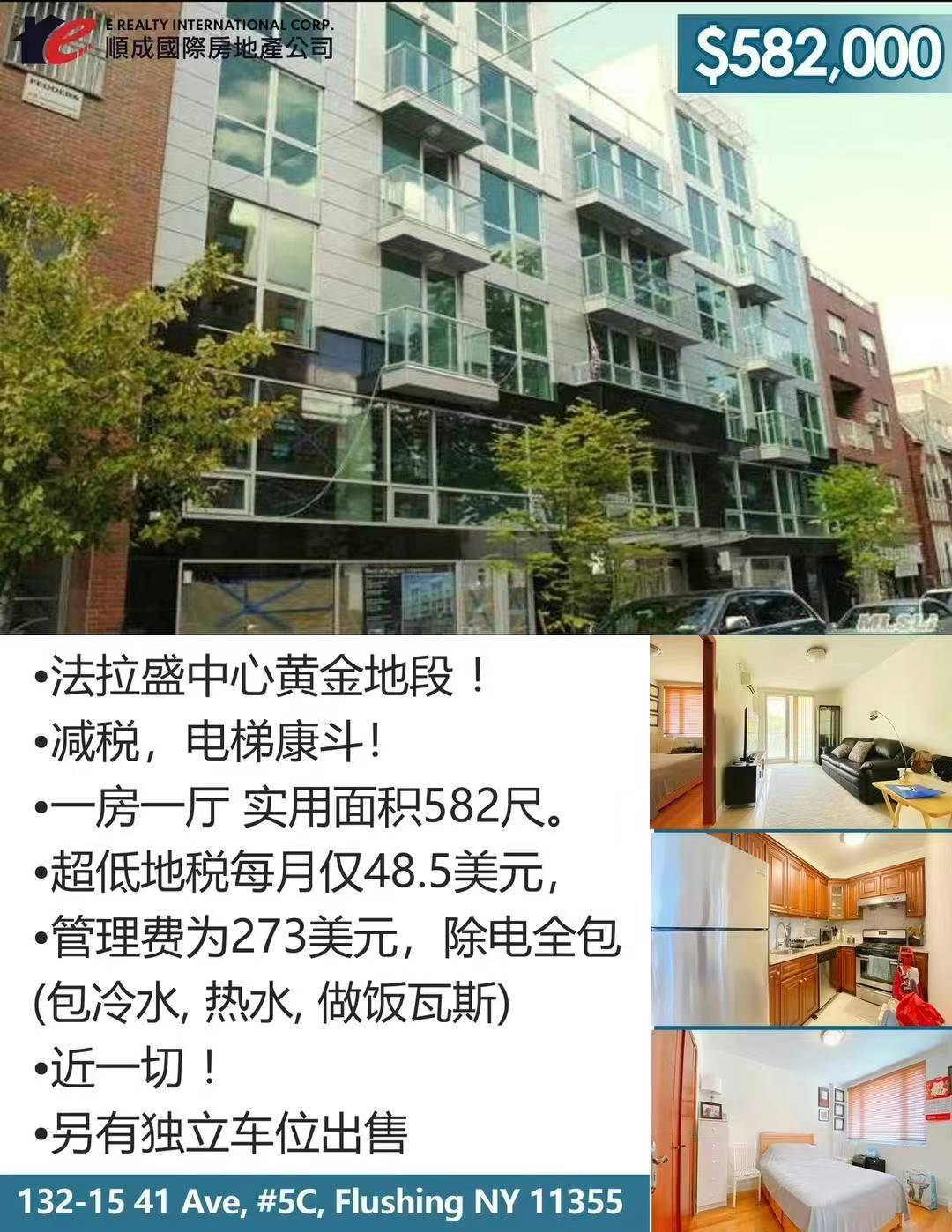 Flushing法拉盛康斗出售Flushing NY Luxury Condo for sale新上市法拉盛康斗预售 出售:法拉盛中心黄金地段 !减税,电梯康斗!一房一厅 实用面积582尺。超低地税每月仅48.5美元,管理费为273美元,除了电全包(包冷水,热水,做饭瓦斯)。交通便利,近一切 !售58万2 另有独立车位出售7万 212 810 9985