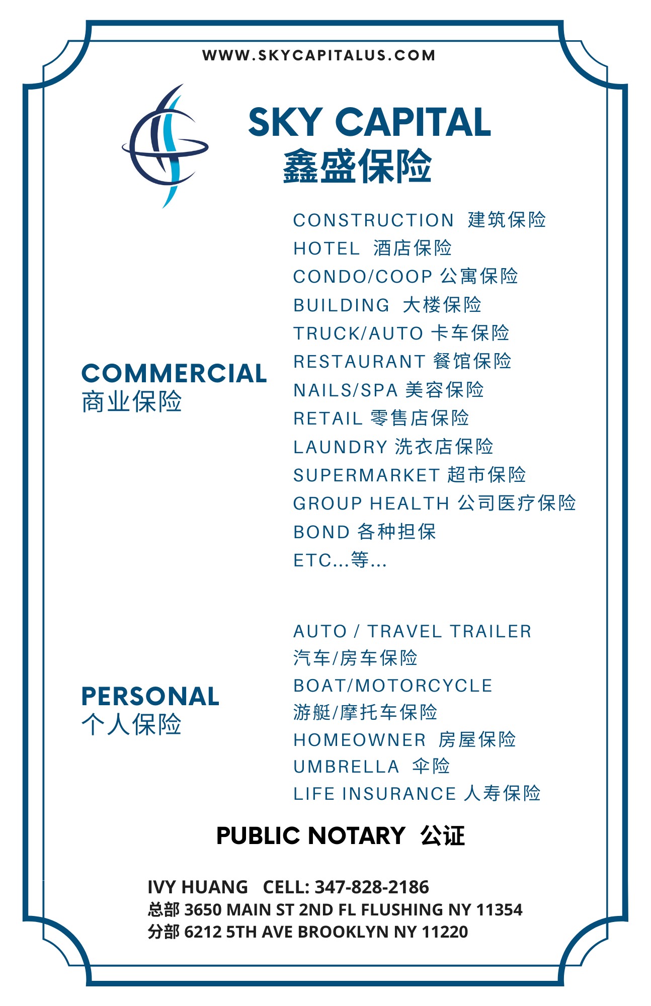 商业类:汽车保险(个人,美东美西卡车保险,商业牌照);各类房屋,大楼,仓库,coop保险;指甲按摩店餐馆保险;建筑GC,分包商,室内家装保险;劳工险;伞险等。