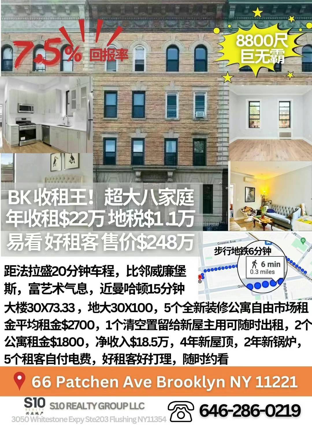 4年新屋顶,2年新锅炉,5家租客自付电费,一个口路到J, M train. 大楼30X73.33, 面 积8800尺,地大30X100, 地税$1.1万,净收入$18.5万,售价$248万
