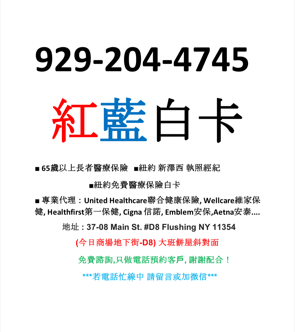 法拉盛台一保險代理 維家Wellcare 保險,第一保健 Healthfirst , 聯合健康保險 紅藍白卡雙重資格計劃,福利大放送!