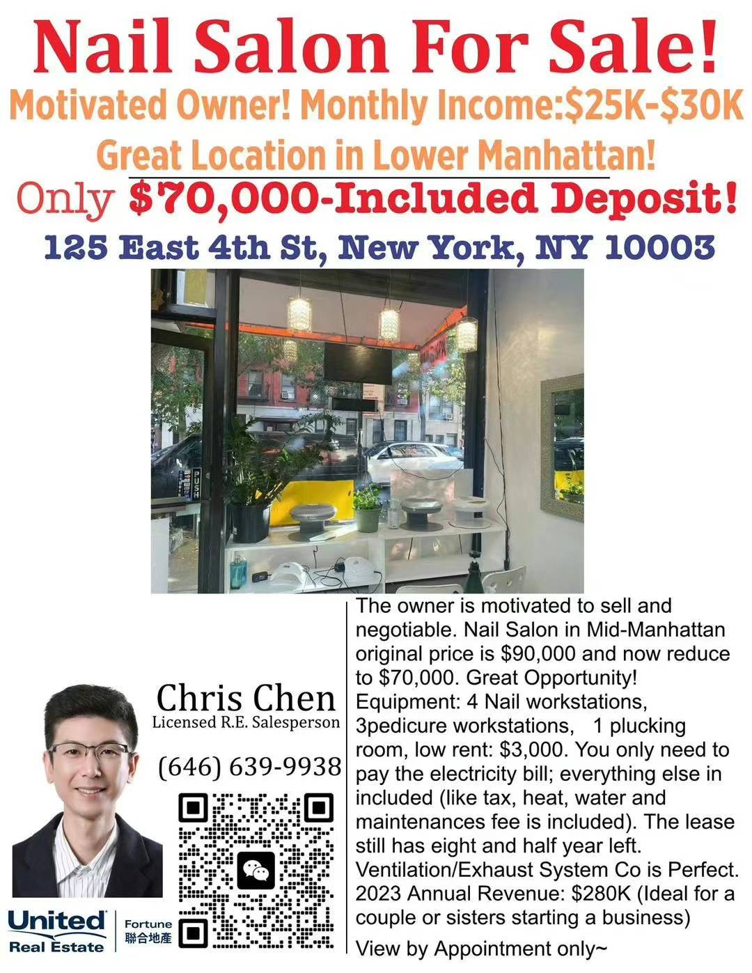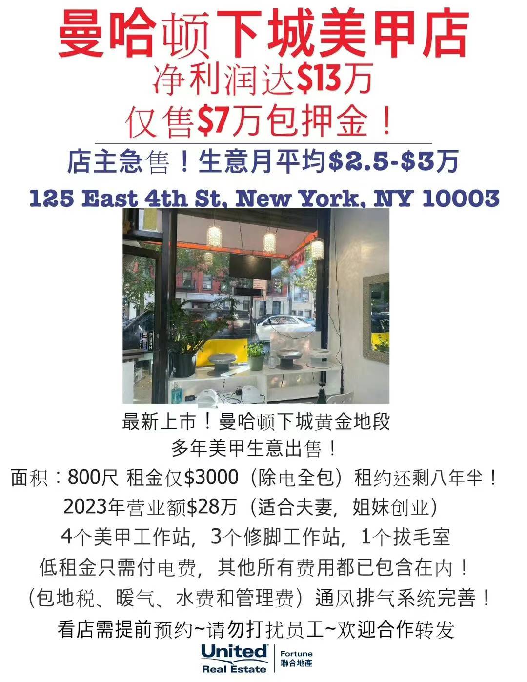 🔥年净利润🉑达13万曼哈顿下城黄金地段1楼临街店面多年美甲生意出售