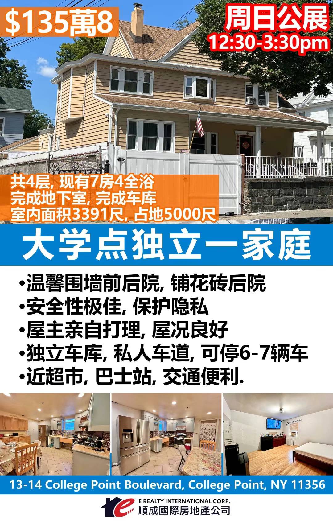 College Point大学点房子出售 College Point NY 新上市大学点房屋出售 🔥今天公展,周日: 12:30-3:30PM大学点独立一家庭, 共4层, 现有7房4全浴