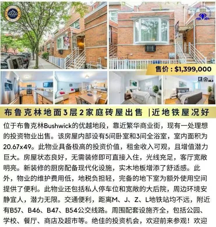 👑房子介绍:位于布鲁克林Bushwick的优越地段,靠近繁华商业街,现有一处理想的投资物业出售。该房屋内部设有5间卧室和3间全浴室,室内面积为20.67x49。此物业具备极高的投资价值,租金收入可观,且增值潜力巨大。房屋状态良好,无需装修即可直接入住,光线充足,客厅宽敞明亮。新装修的厨房配备现代化设施,实木地板增添了舒适感。此外,物业的维护费用低,地税负担轻,完备的地下室为额外使用空间提供了便利。此物业还包括私人停车位和宽敞的大后院,周边环境安静宜人,潜力无限。交通便利,距离M、J、Z、L地铁站均不远,附近有B57、B46、B47、B54公交线路。周围配套设施齐全,包括公园、学校、餐厅、商店及超市等。绝佳的投资机会,欢迎前来参观!347 988 2798