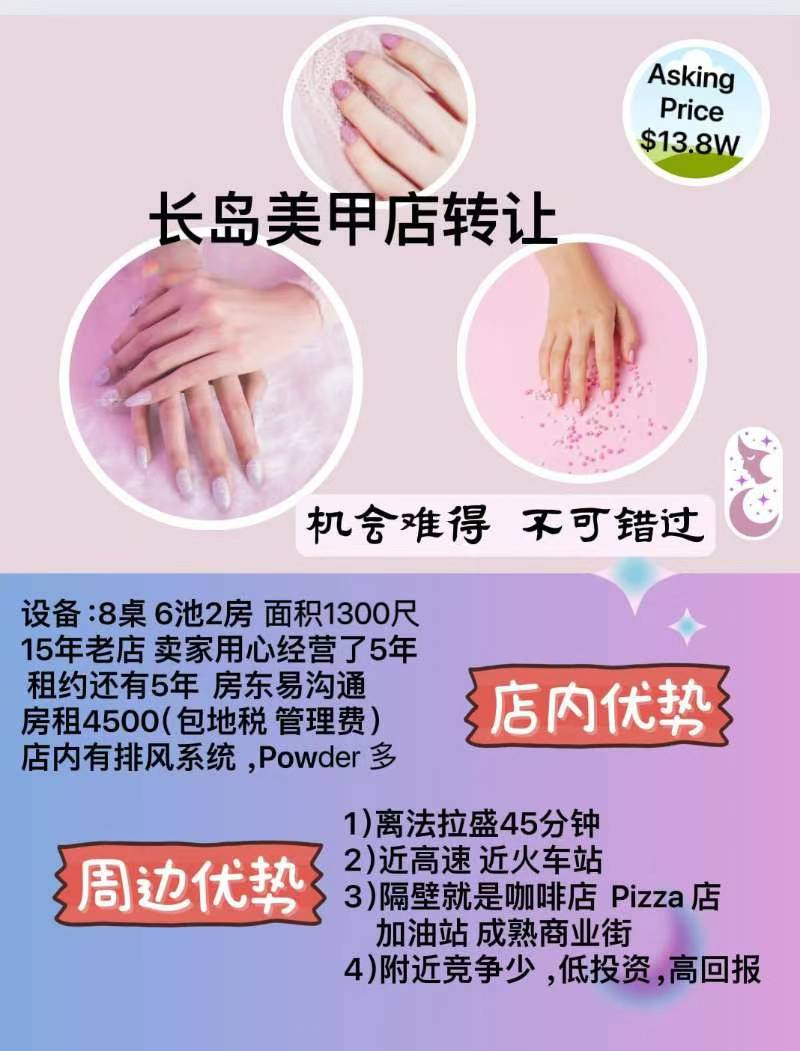 纽约指甲店出售 新上市纽约餐馆转让新上市纽约生意转让 新上市Asking