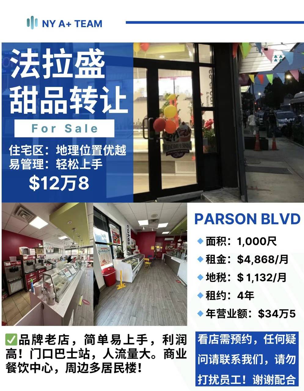🆕🏙️法拉盛Parson Blvd品牌冰淇淋店转让 🏙️法拉盛商铺出售 生意转让 新上市