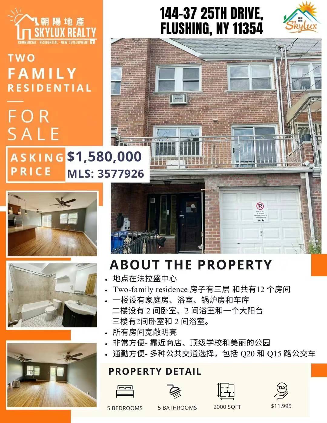 🆕 地点!稀有法拉盛中心地段❗️合法两家庭553格局 地2000, 屋20X50, 地面三成 屋面积2850平方英尺、地税11995