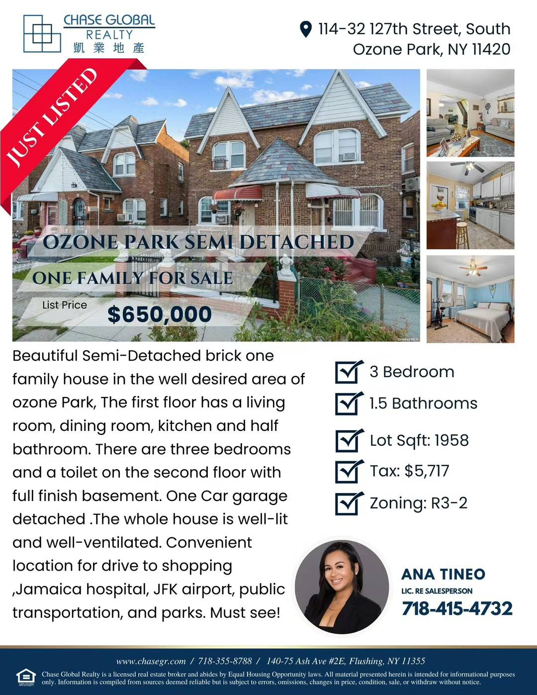 Ozone Park NY皇后区奥松公园房子出售新上市奥松公园房屋出售🔥凯业地产South Ozone Park 一家庭出售 仅售65万🔥
