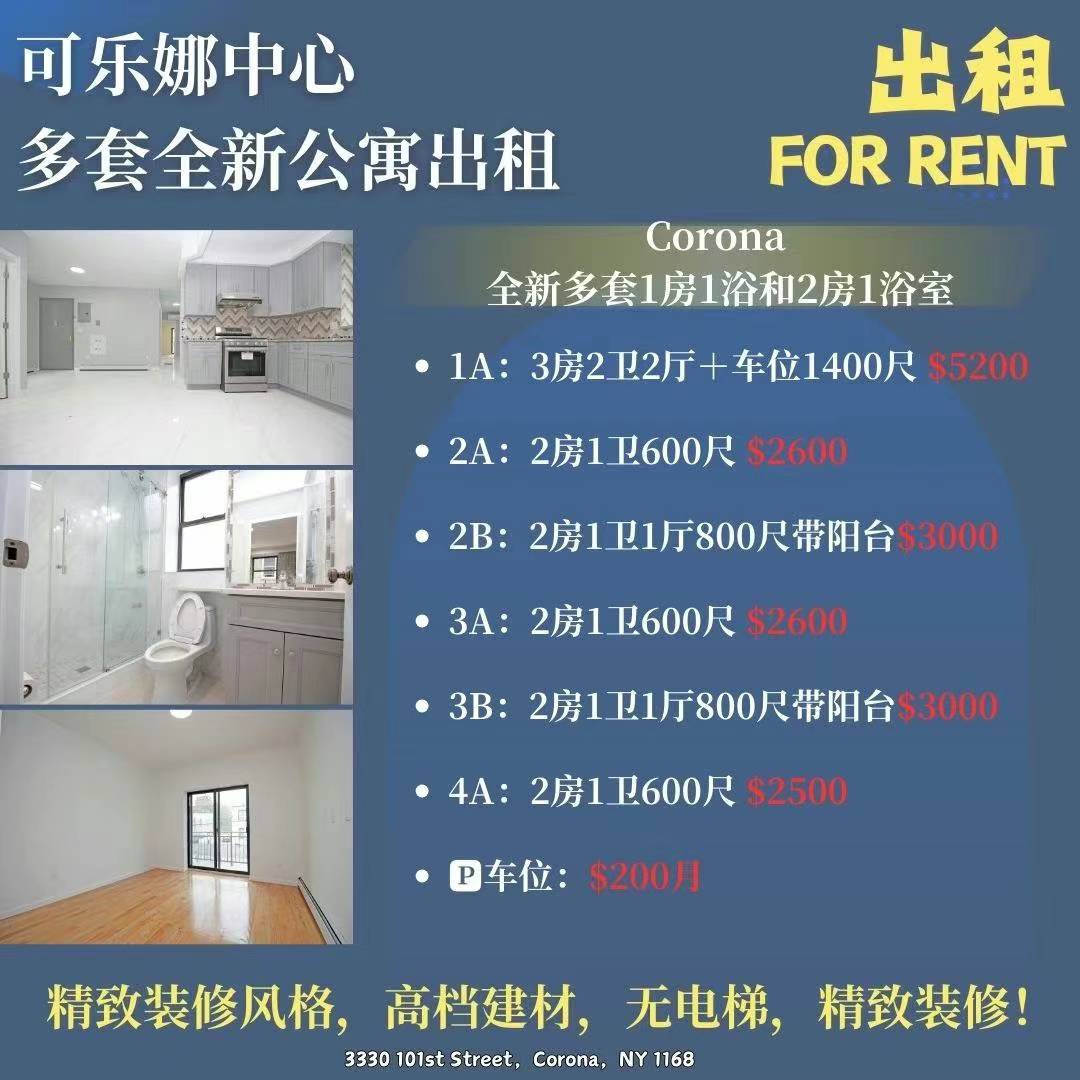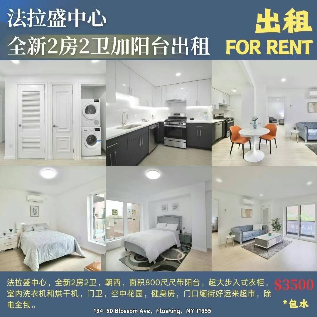 法拉盛中心,全新2房2卫,朝西,面积800尺尺带阳台,超大步入式衣柜,