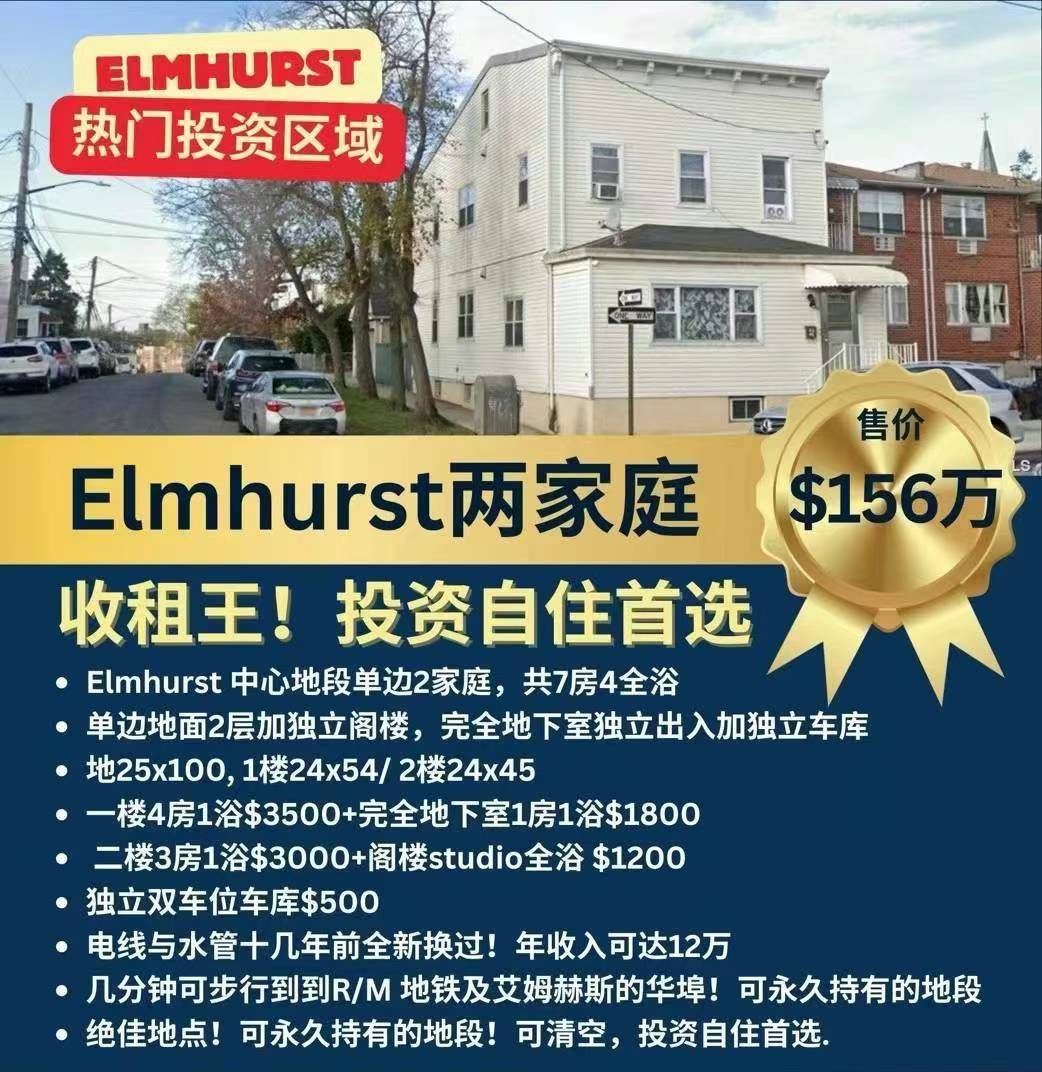 🔔Elmhurst艾姆赫斯特房子出售Elmhurst NY新上市艾姆赫斯特房屋出售🔔🔔独家代理Elmhurst 中心地段单边2⃣️家庭