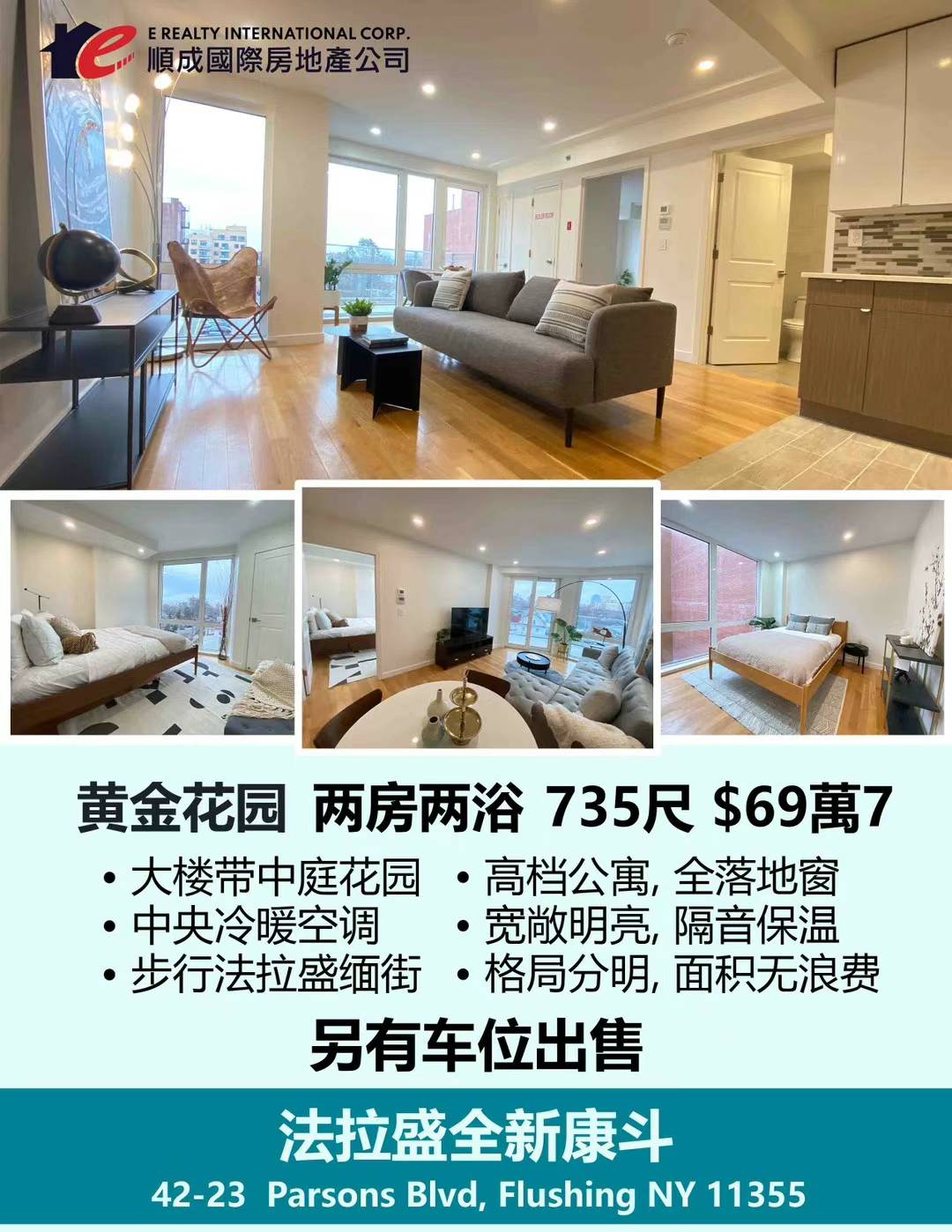 Flushing法拉盛康斗出售Flushing NY Luxury Condo for sale新上市法拉盛康斗预售 顺成独家代理, 黄金花园, 2房2浴康斗735尺, 仅售$69萬7