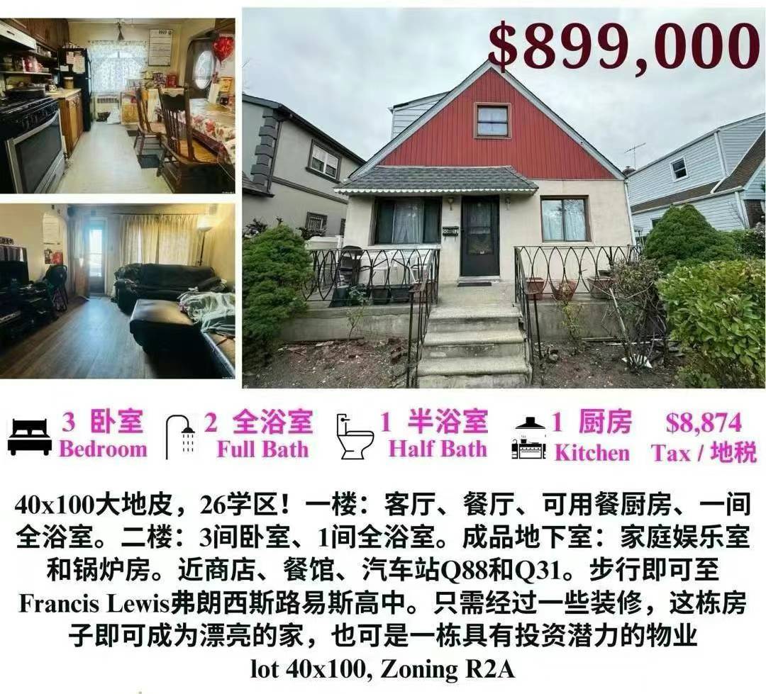 地税$8874地段很方便,近学校,超市,公车直接到法拉盛缅街,房子需要装修。917 293 8698