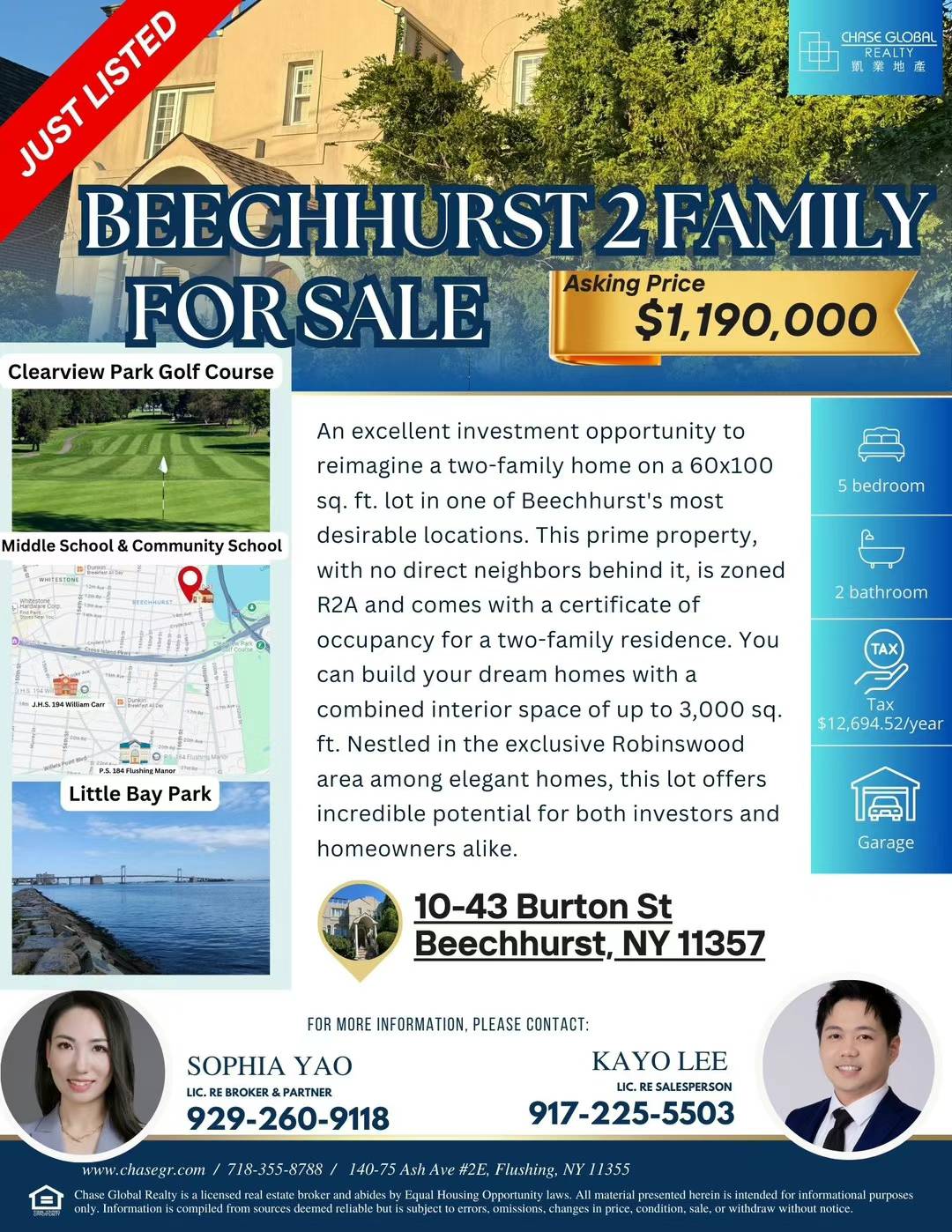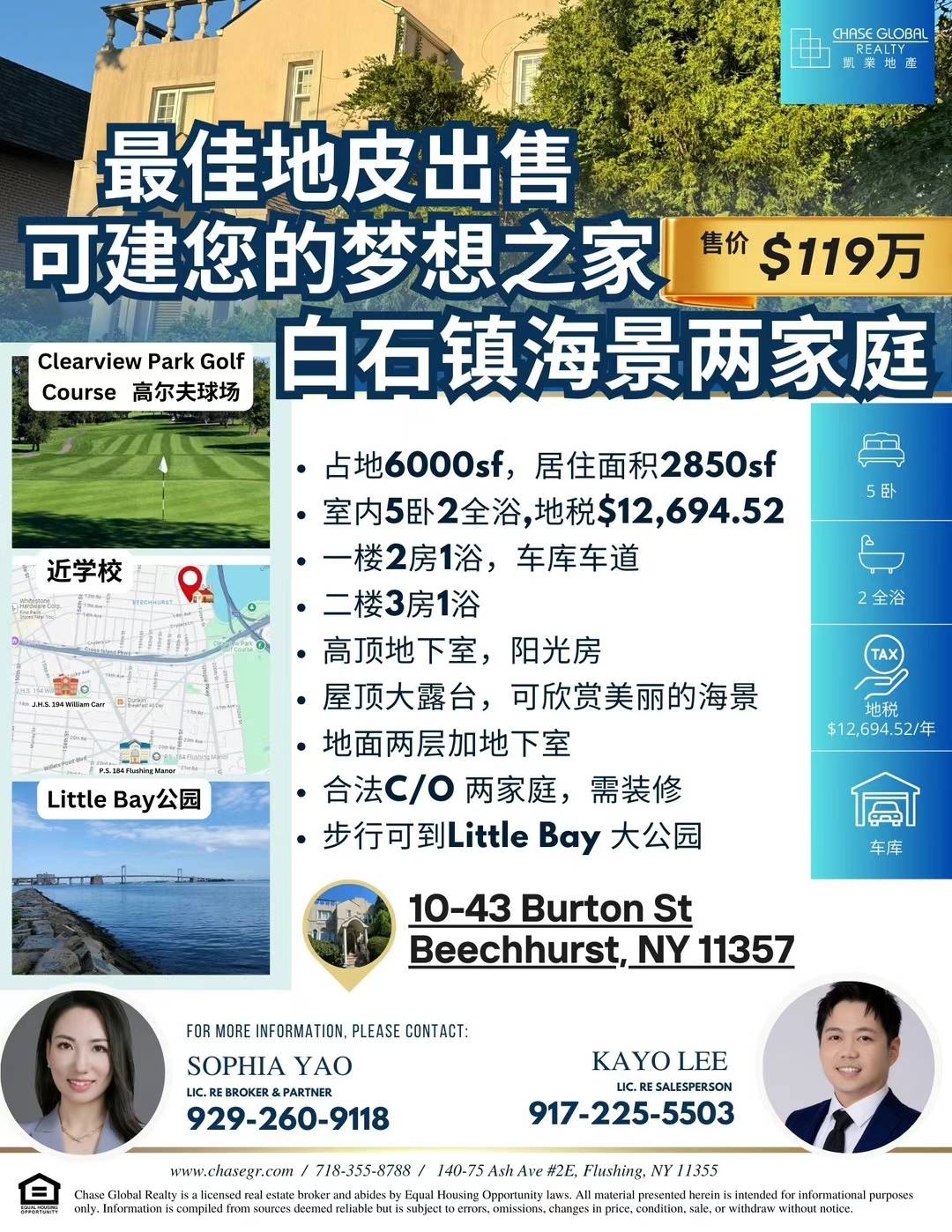 Whitestone白石镇房子出售Whitestone NY新上市白石镇房屋出售🔥最佳地皮出售,可建您的梦想之家白石镇海景两家庭. 🔥售价 S119万