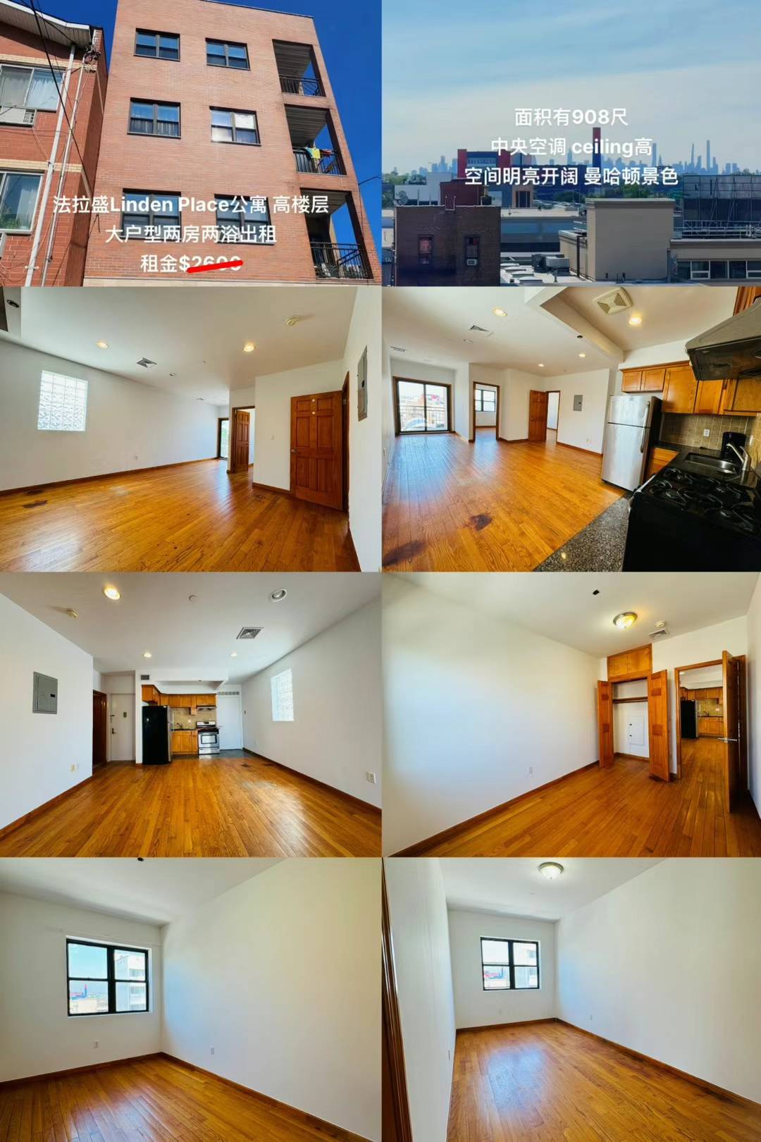 Flushing法拉盛公寓出租Flushing NY Coop for rent新上市法拉盛大楼出租 法拉盛Linden Pl 大户型两房两浴公寓出租(908SF)高楼层 曼哈顿view 中央空调 有阳台 $2400 没电梯 可小宠欢迎经纪合作转发🤝🏻