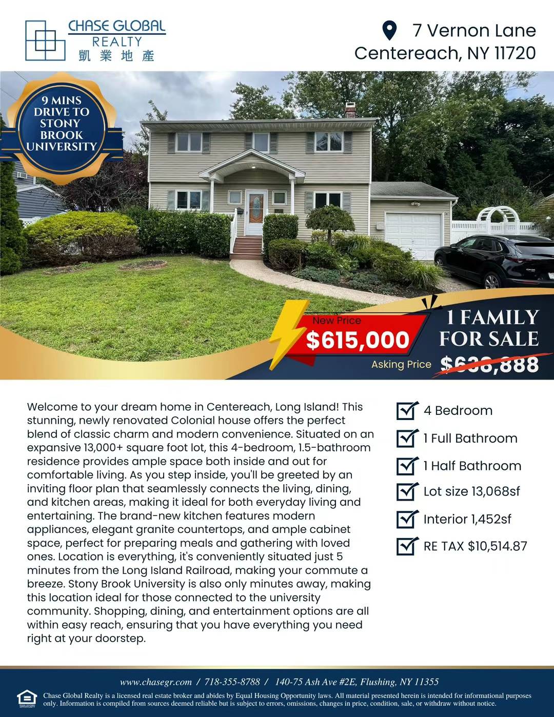 Long Island长岛房子出售 Long Island NY新上市长岛房屋出售👏凯业地产一家庭新上市 长岛Centereach别墅 仅售$$615,000! 开车9分钟即可到石溪大学!