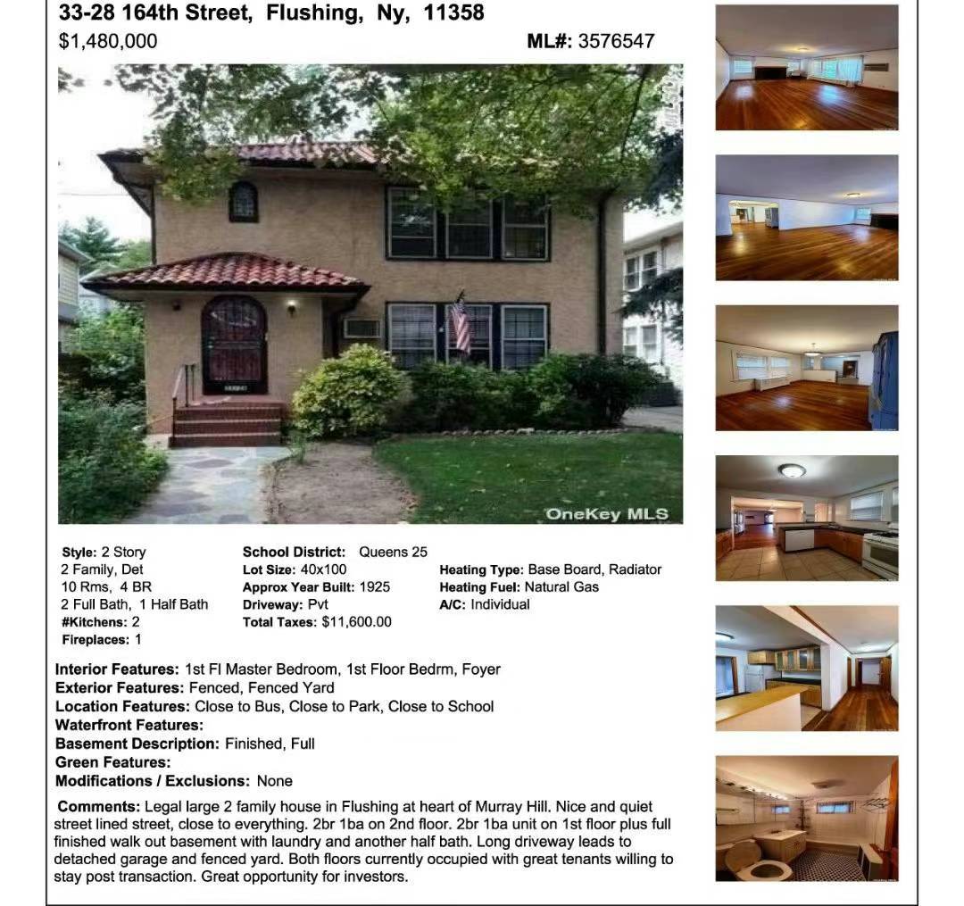 Flushing法拉盛房子出售Flushing NY House for sale新上市法拉盛房屋出售 北法拉盛合法2家庭 $148万。地40x100,楼30x36. 每层2房1浴加地下室。646 301 8280