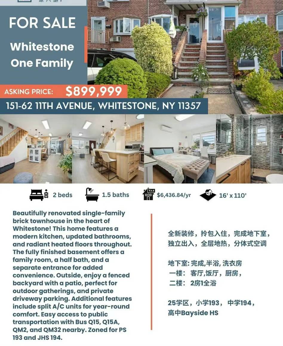 Whitestone白石镇房子出售Whitestone NY新上市白石镇房屋出售🔥新上市白石镇联排家庭 🧧售89万9