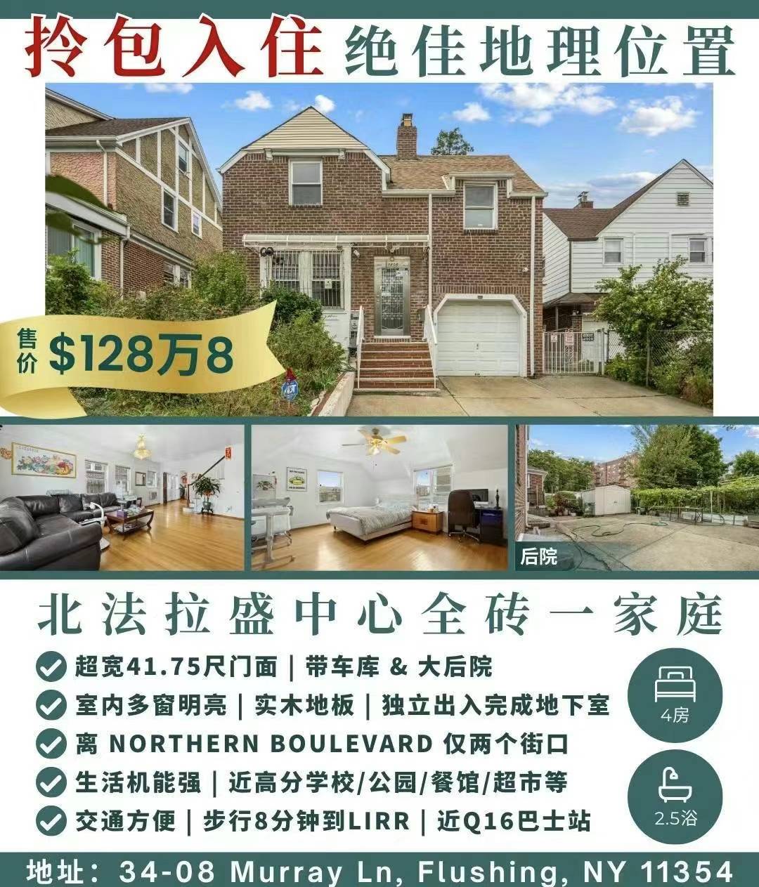 Flushing法拉盛房子出售Flushing NY House for sale新上市法拉盛房屋出售 Ⓜ️北法拉盛全砖一家庭 今天1点可以看 需预约$128.8万 34-08 Murray Lane