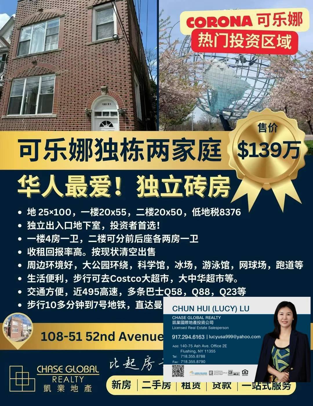 Corona可乐娜房子出售Corona NY新上市可乐娜房屋出售凯业地产独家代理,Corona两家庭 投资房 出售华人最爱,独立砖房,大型两家庭