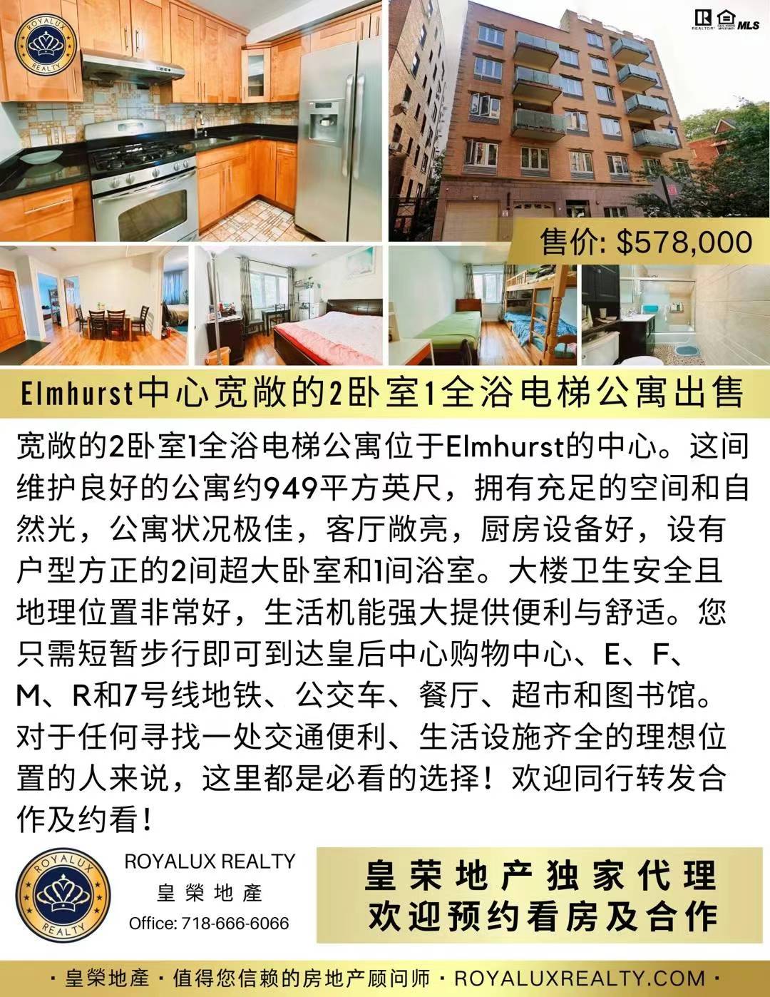 Elmhurst艾姆赫斯特房子出售Elmhurst NY新上市艾姆赫斯特房屋出售👑皇荣地产新上市独家代理好房源👑Elmhurst中心宽敞的2卧室1全浴电梯公寓出售| 售价仅57.8万👑康斗介绍: