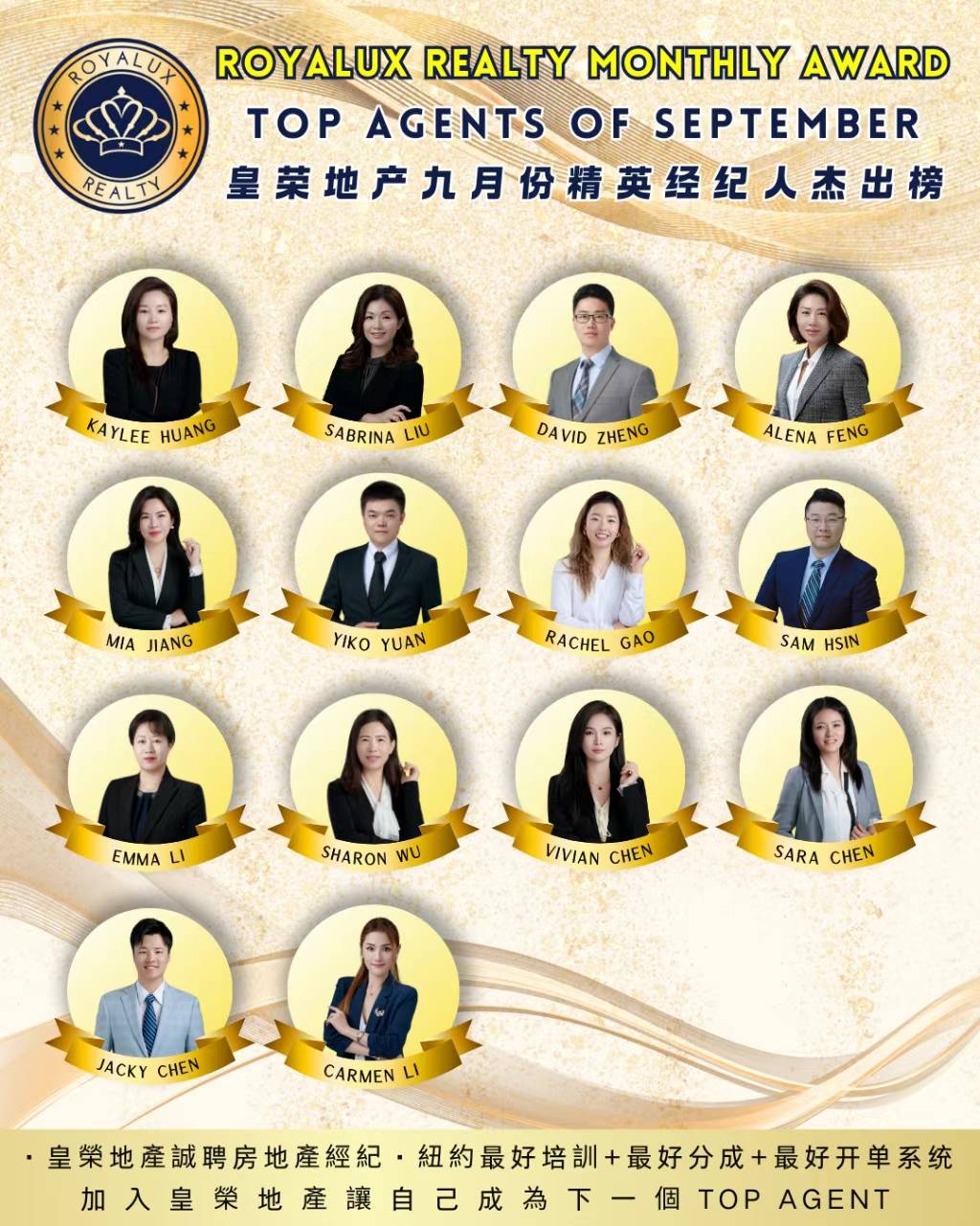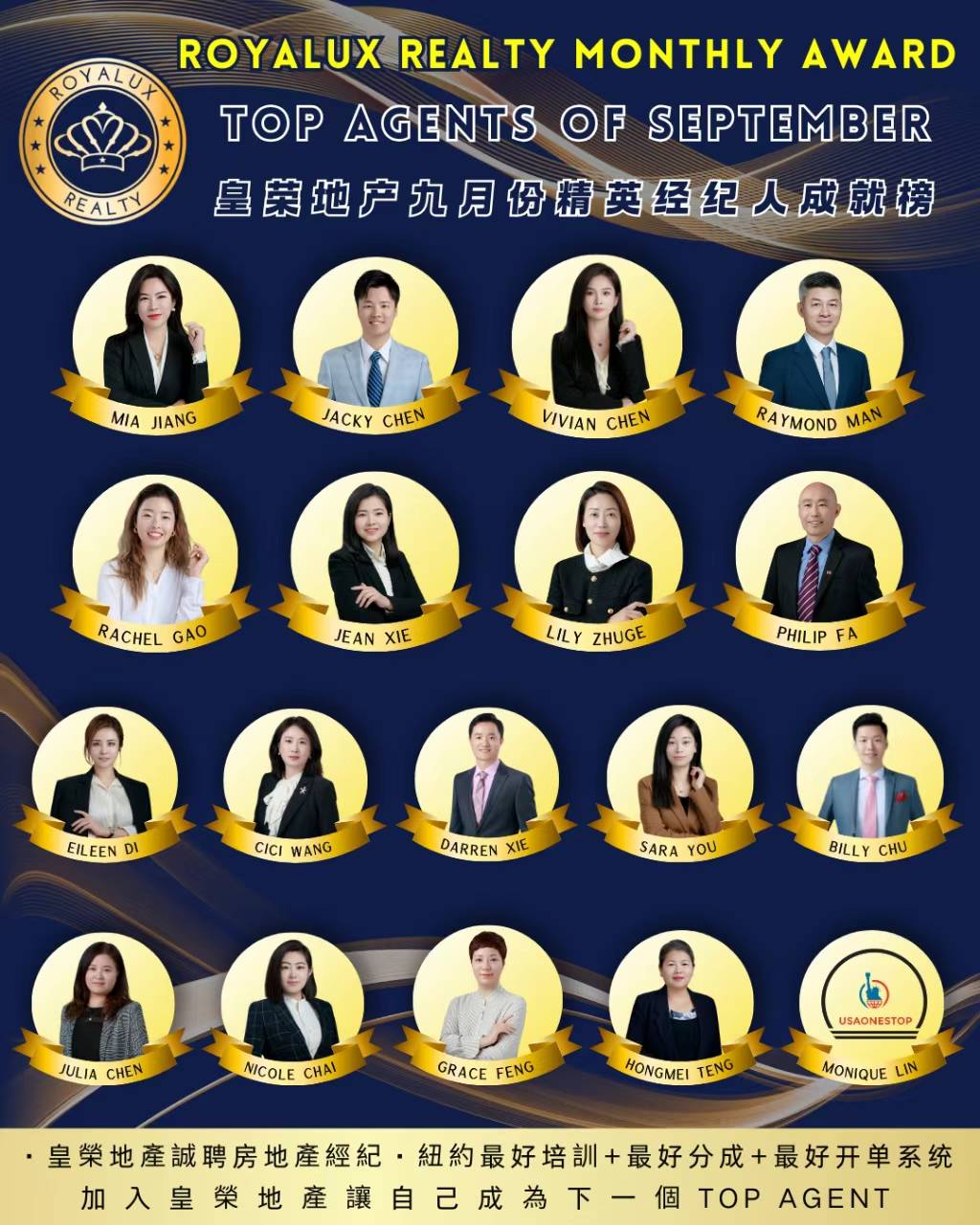 纽约地产经纪 纽约华人房地产公司纽约房地产经纪人🥇很荣幸9月份上了【皇荣地产销售精英成就榜】!衷心感谢每个客户的信任和支持。作为皇荣地产的杰出经纪人,我将竭诚为您提供一流的房地产服务。
