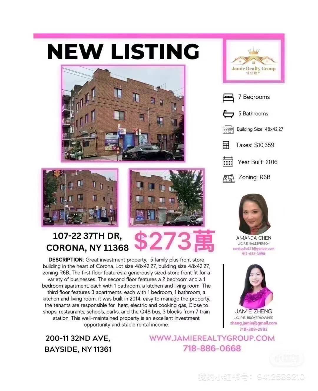 这是一栋包含5户住宅和一个店面建筑。地块尺寸为48x42.27,建筑尺寸为48x42.27,分区为R6B。第一层设有宽敞的店面,可适合多种业务使用。第二层包括一个两居室和一个一居室公寓,每个公寓都有一个浴室、一个厨房和一个客厅。第三层设有三个一居室公寓,每个公寓都有一个浴室、一个厨房和一个客厅。该建筑建于2014年,大樓設有電梯🛗易于管理,租户负责供暖、电力和做饭用气。周边设施齐全,靠近商店、餐馆、学校、公园和Q48巴士站,距离7号地铁站仅三个街区。一个极好的投资机会,能带来稳定的租金收