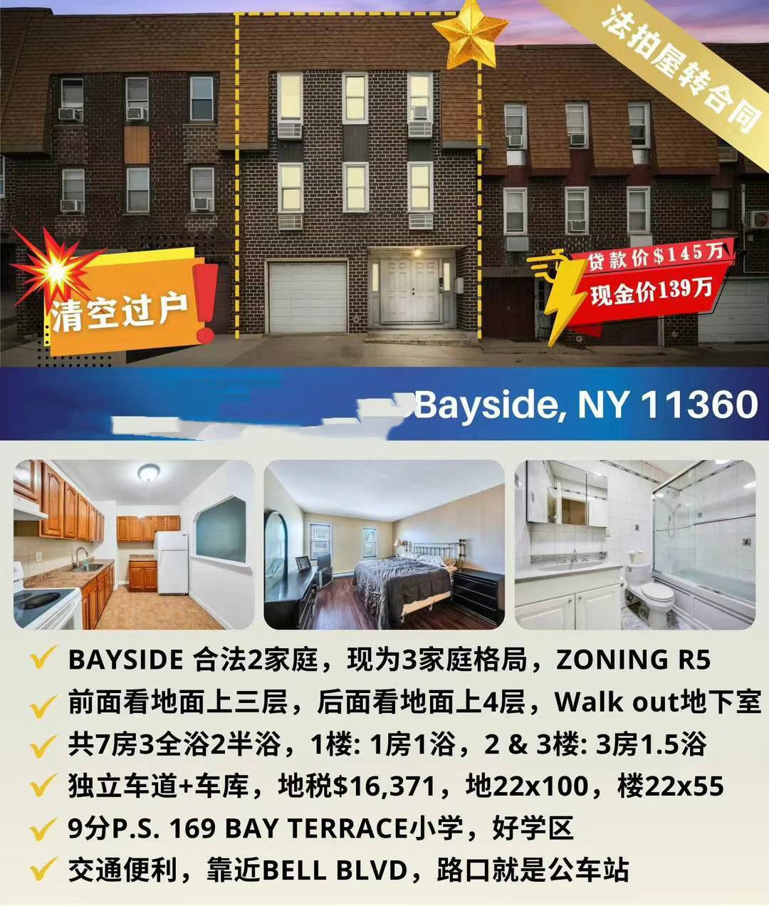 Bayside贝赛房子出售Bayside NY新上市 贝赛房屋出售 🎡国庆节捡漏活动开启🎡 🀄️法拍屋🀄️ 转合同 10/8号 周二 first showing ,❕清空过户⏰ 全现金价139万,贷款价145 👍 地22x100 zoning R5. 前面看地面三层, 后面看地面4层 , 俩家庭C/O 可改合法三家庭或4家庭 地税$16,371.