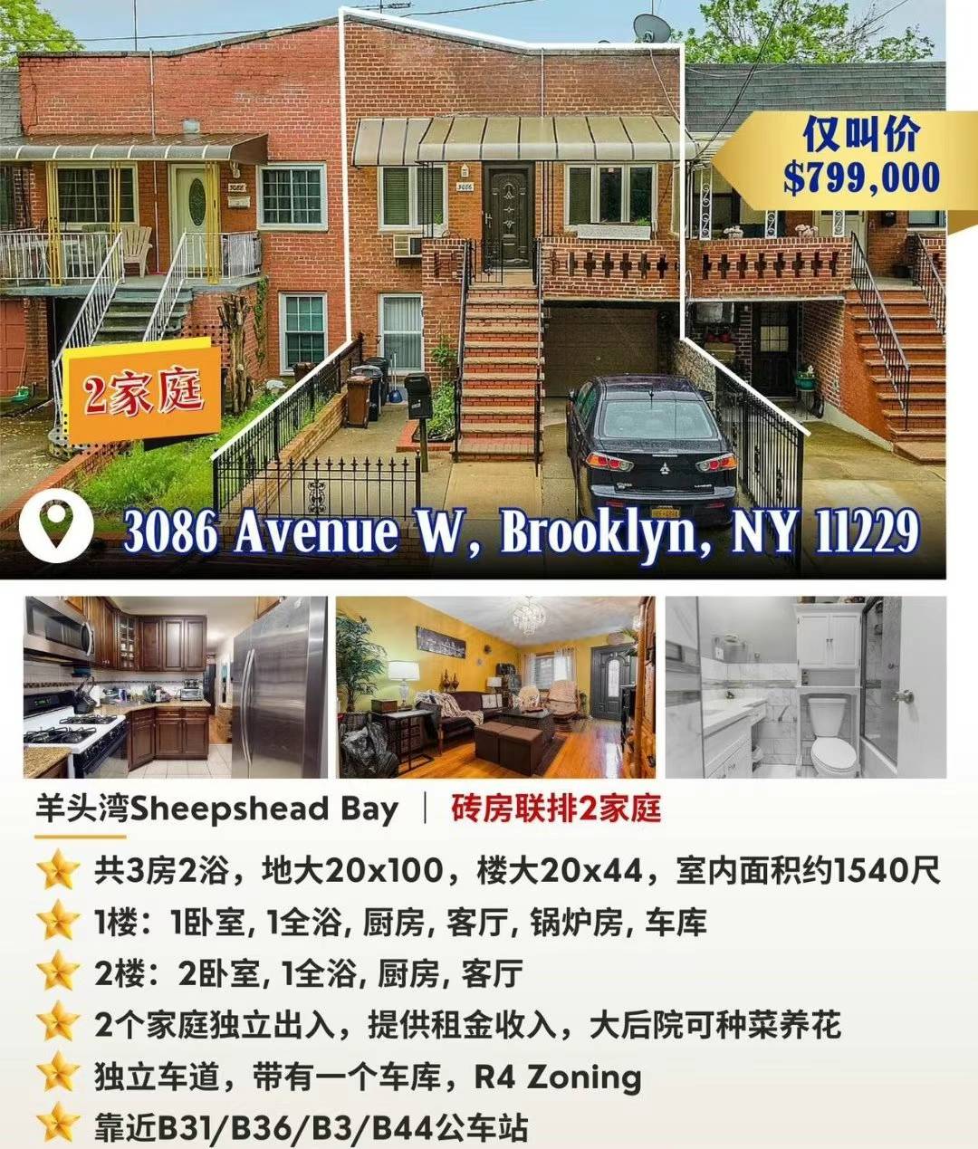 Brooklyn布鲁克林房子出售 Brooklyn NY布碌仑新上市房屋出售来电预约718-683-8316 布鲁克林brooklyn 【羊头湾Sheepshead Bay砖房联排2家庭】出售