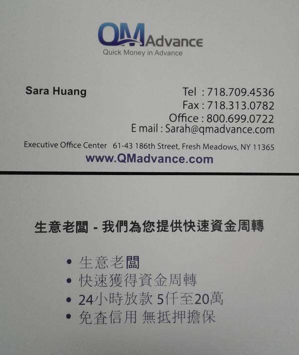 快速獲得資金週轉, 5仟 至 20萬, 一天到帳, QM直接放款, 沒有隱藏費用, 不查信用, 快速簡易, 餐館, 超市, 批發, 零售, 甲店, 美容Spa, 洗籠, 乾洗店, 生意老闆, 商家急需資金請速電 Sara黃 718-535-2883 網站: www.qmadvance.com