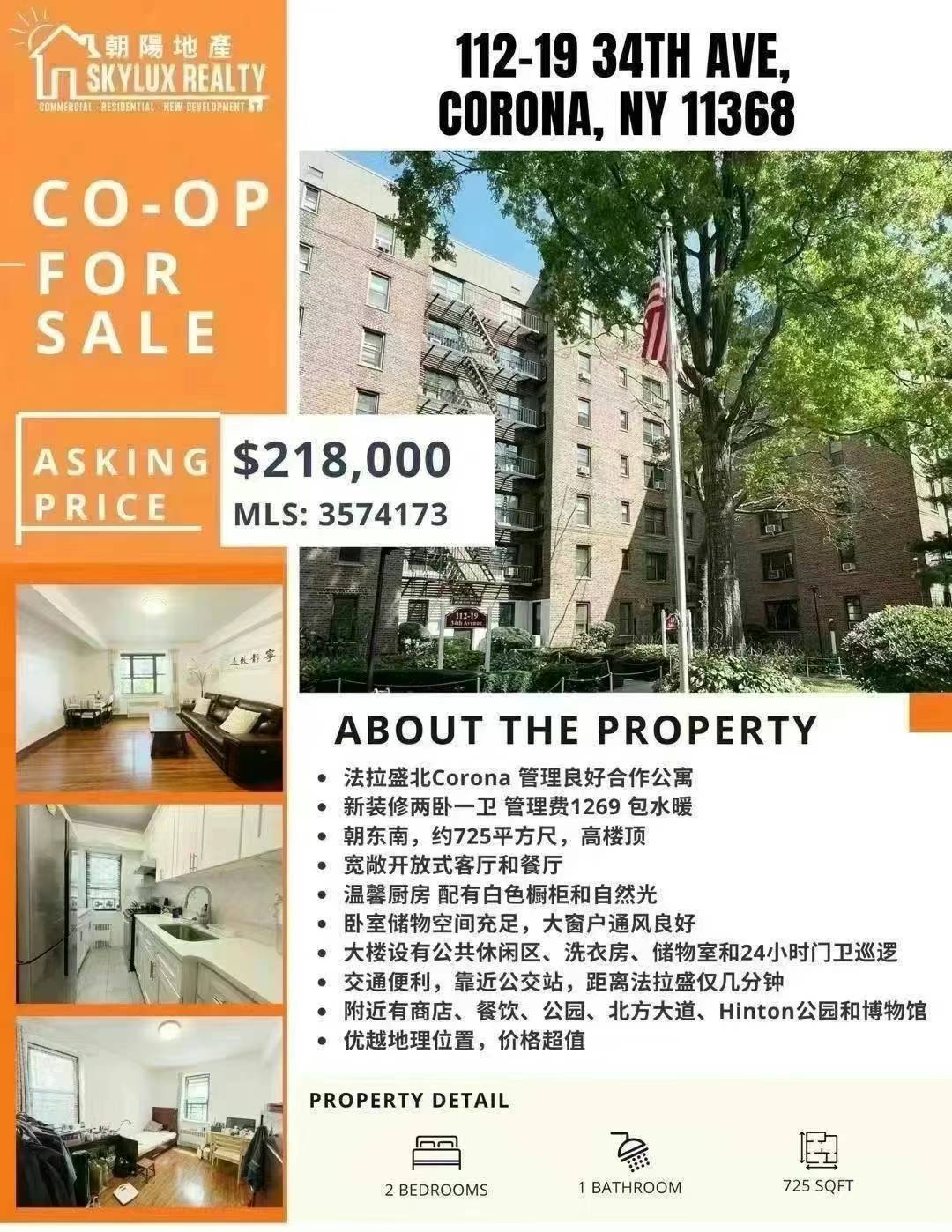 可乐娜管理良好的合作公寓 位于热闹的法拉盛北corona,新装修两卧一卫、采光充足,朝东南方向 约725平方尺高顶、管理费包水暖、格局佳