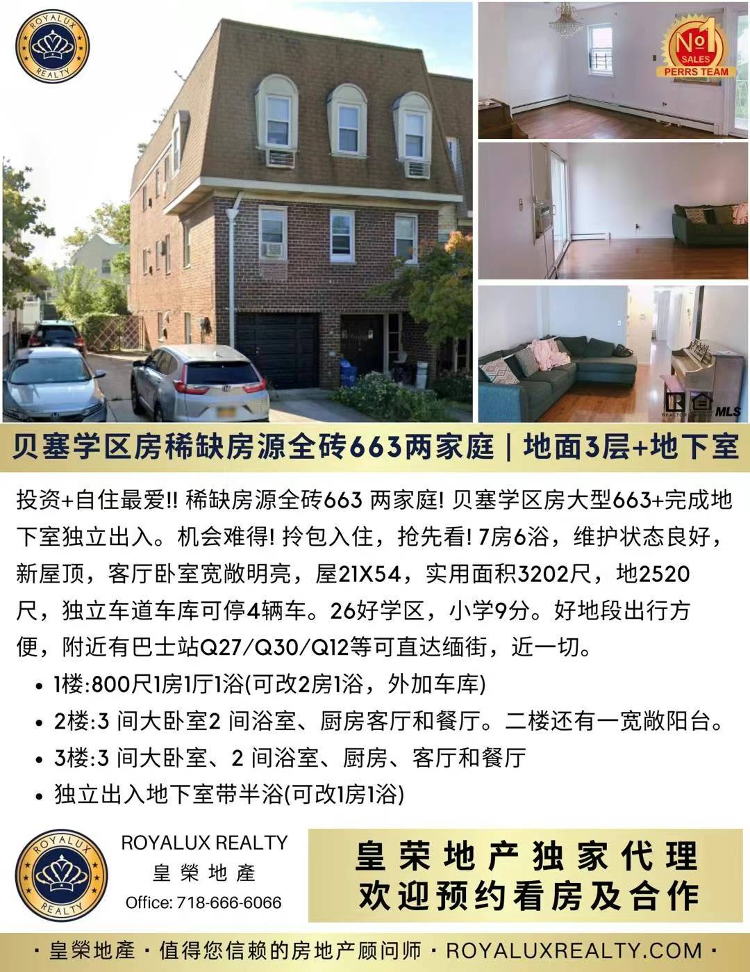 投资+自最住爱!! 稀房缺源全砖663 两家庭! 贝学塞区房大型663+完地成下室独立出入。机难会得!拎包入住,抢先看! 7房6浴,维状护态良好,新屋顶,客卧厅室宽敞明亮,屋21X54,实面用积3202尺,地2520尺,独车立道车库可停4辆车。26好学区,小学9分。好段地出行方便,附有近巴士站Q27/Q30/Q12等直可达缅街,近一切。
