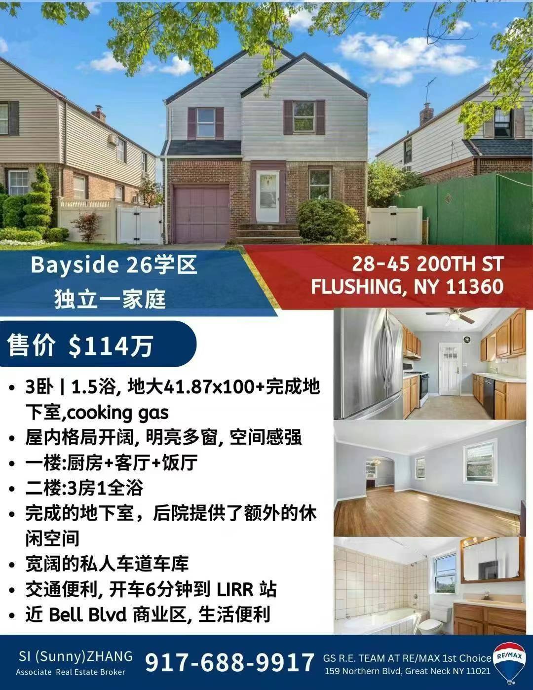 Bayside贝赛房子出售Bayside NY新上市 贝赛房屋出售 独家代理 💰叫价114万