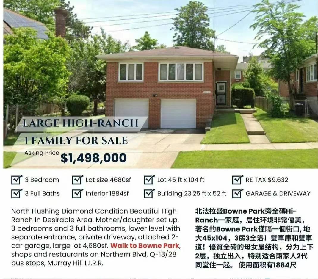 🩵北法拉盛Bowne Park旁全磚Hi-Ranch一家庭,居住环境非常優美,