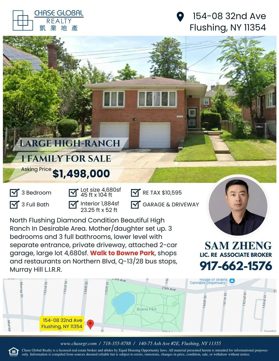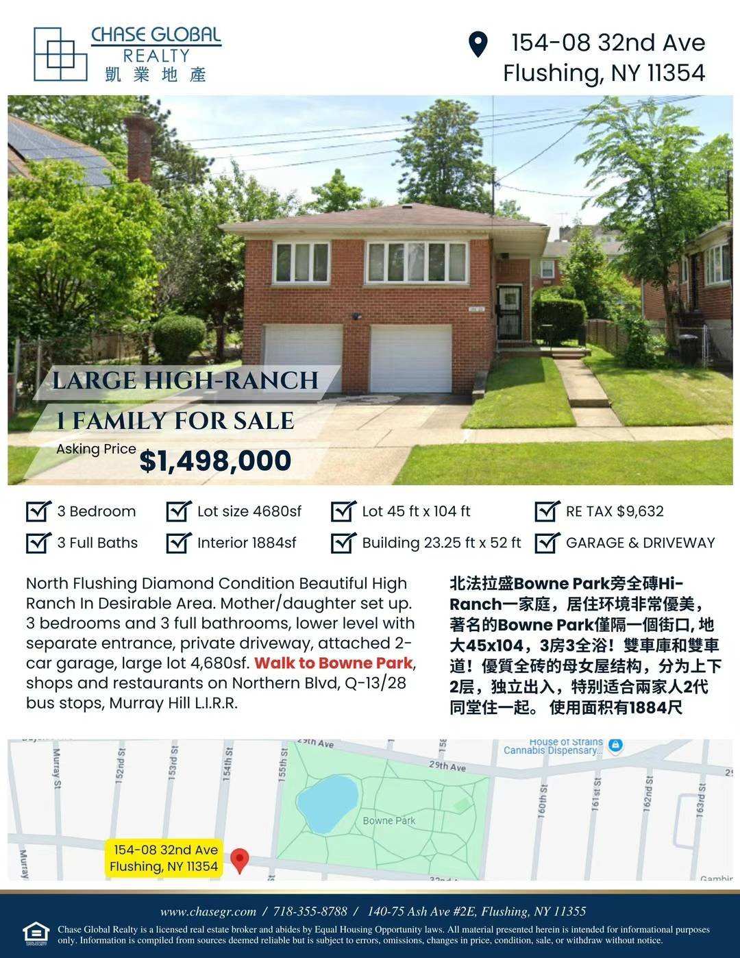 Flushing纽约法拉盛房子房屋出售买卖 Flushing NY House for sale新上市法拉盛房屋房子出售买卖 🌟北法拉盛Bowne Park旁漂亮一家庭,预约看房!凱業獨家代理,最新上市!🩵北法拉盛Bowne Park旁全磚Hi-Ranch一家庭,居住环境非常優美,著名的Bowne Park僅隔一個街口