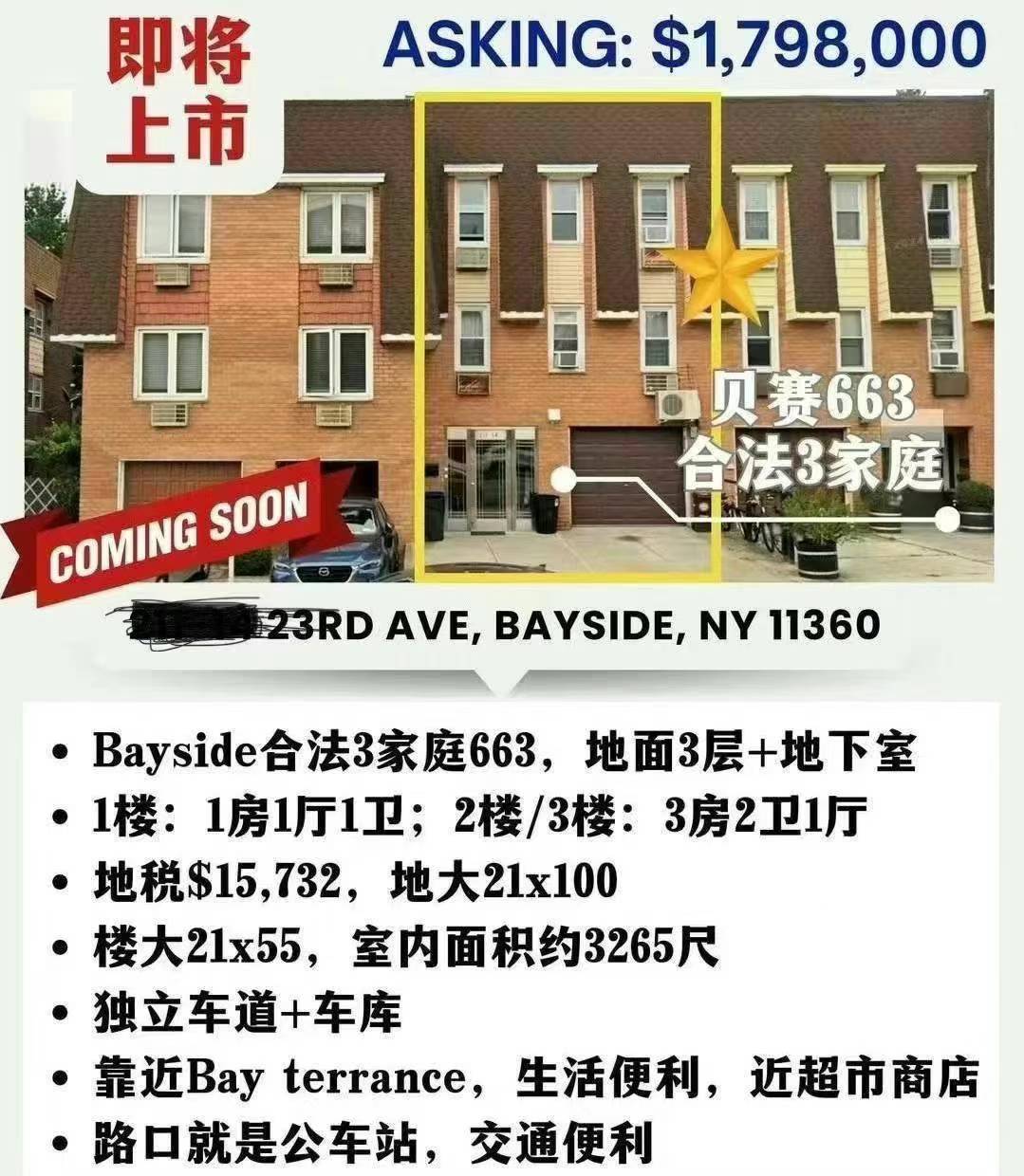 Bayside贝赛房子出售Bayside NY新上市 贝赛房屋出售 【贝赛合法3家庭】出售🌟$182万🔵Bayside合法3家庭663,地面3层+地下室