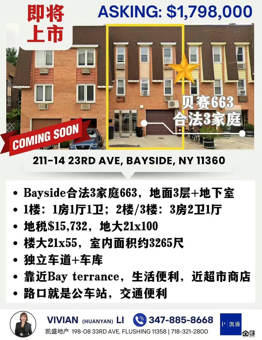 Bayside贝赛房子出售Bayside NY新上市 贝赛房屋出售 【贝赛合法3家庭】出售🌟$182万🔵Bayside合法3家庭663,地面3层+地下室