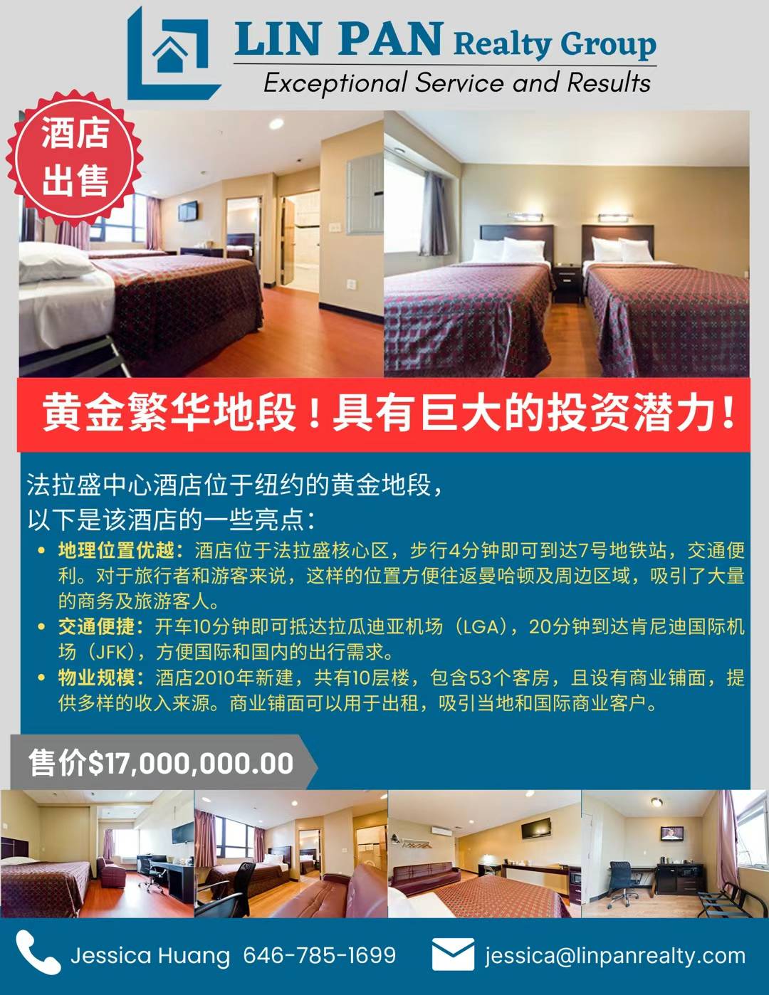 法拉盛酒店出售黄金繁华地段!具有巨大的投资潜力!法拉盛中心酒店位于纽约的黄金地段,以下是该酒店的一些亮点:LIN PAN Realty Group