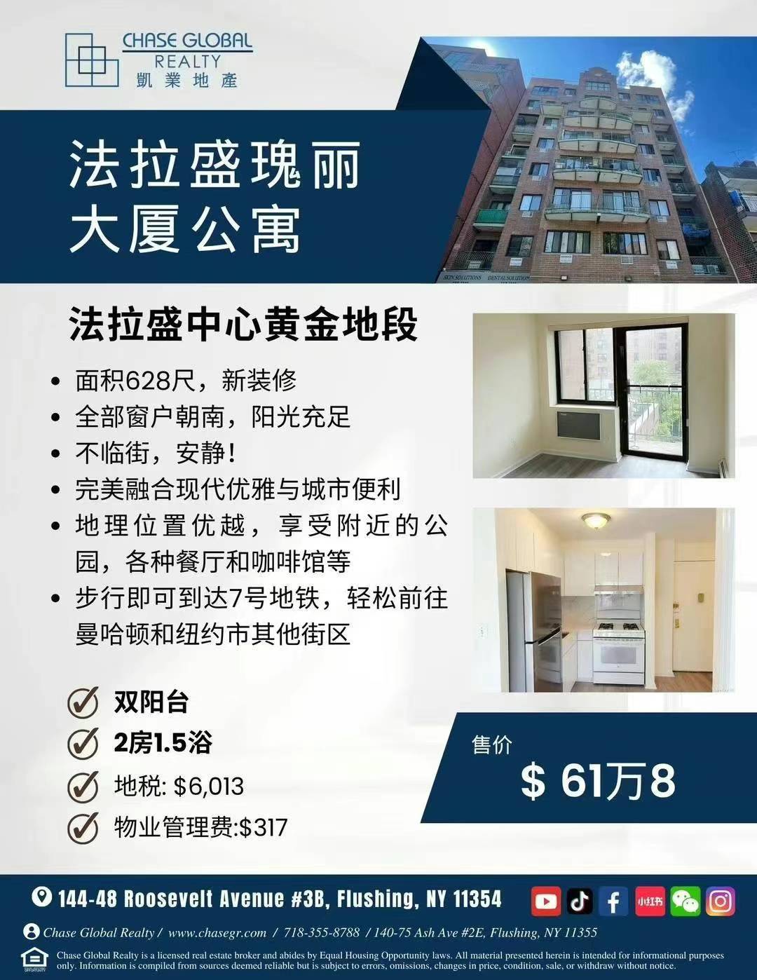 Flushing纽约法拉盛豪华康斗出售Flushing NY Luxury Condo for sale新上市法拉盛华丽康斗预售 法拉盛新裝修康鬥2房1.5浴仅售61万8💐