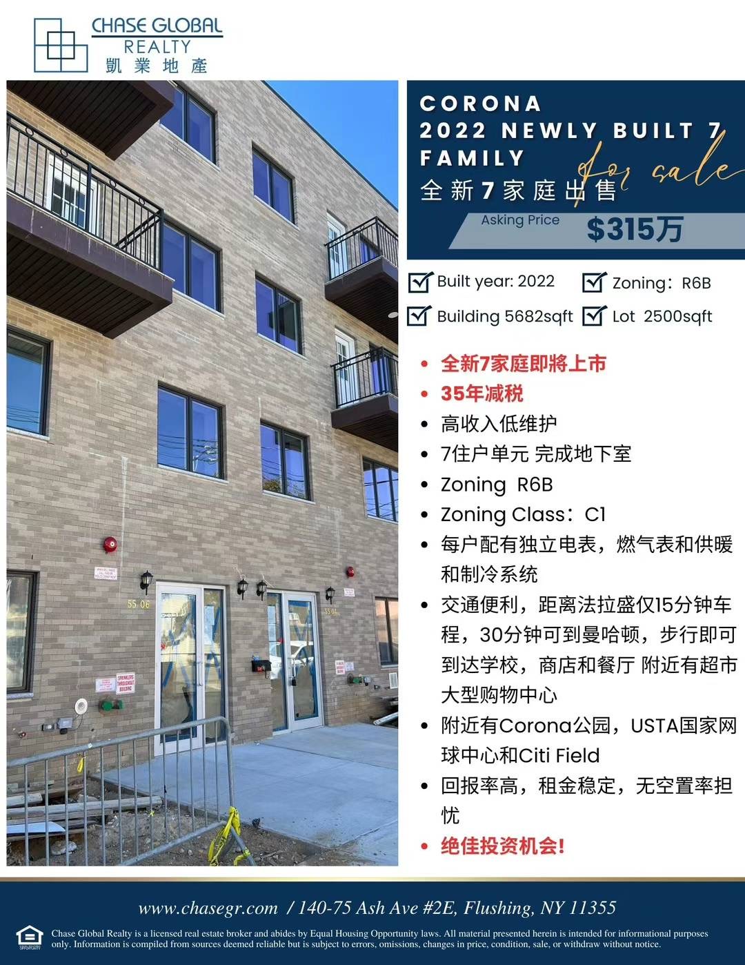 建于2022年,占地2500平方尺,屋积5682平方尺,Zoning C1/R6B,35年减税,高收入,低维护。