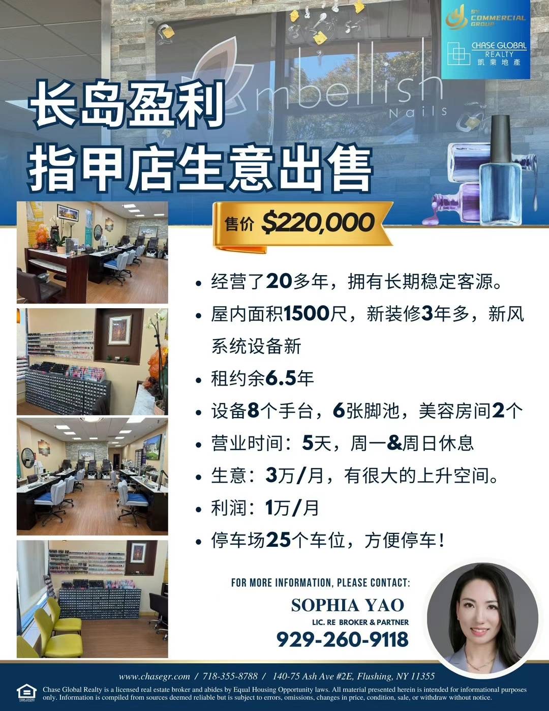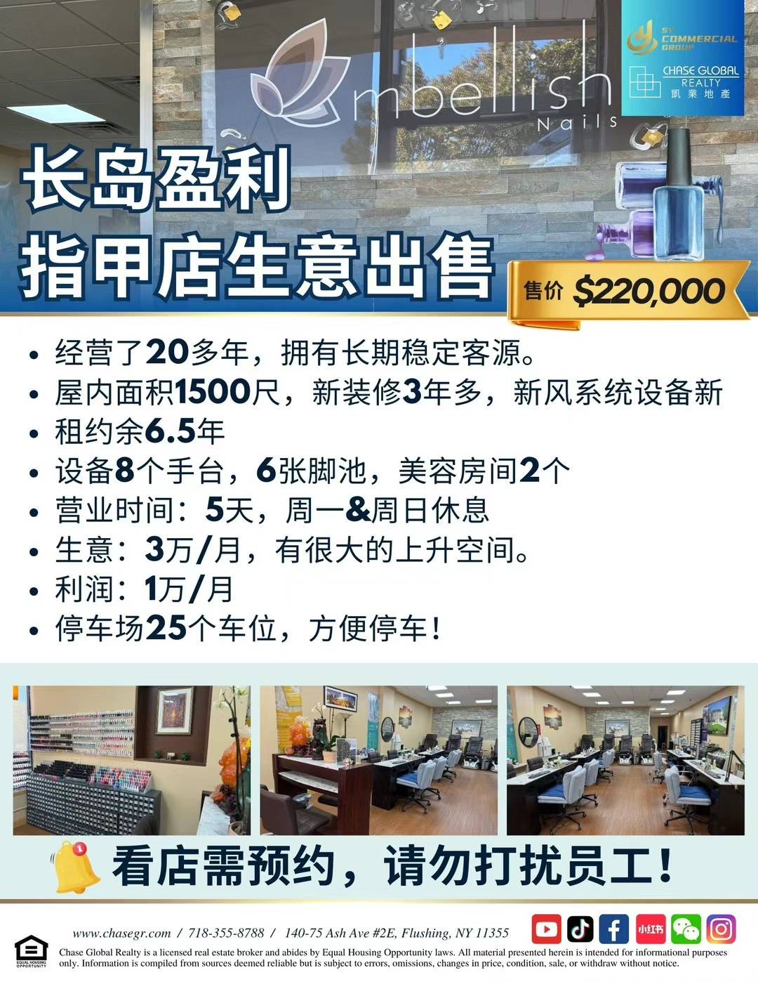 纽约长岛指甲店出售 新上市🔥凯业地产独家代理 长岛盈利 美甲店生意出售🔥💰售价$22万💰