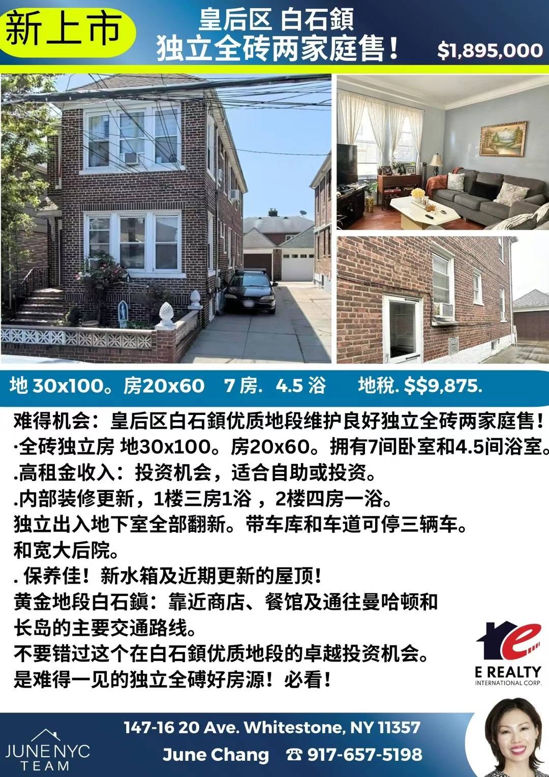 📍白石鎮独立两家庭地30x100房20x60地税$9875欢迎预约来参观!📍147-16 20 Ave Whitestone 11357$1,895,000新上市皇后区 白石顉独立全砖两家庭售!