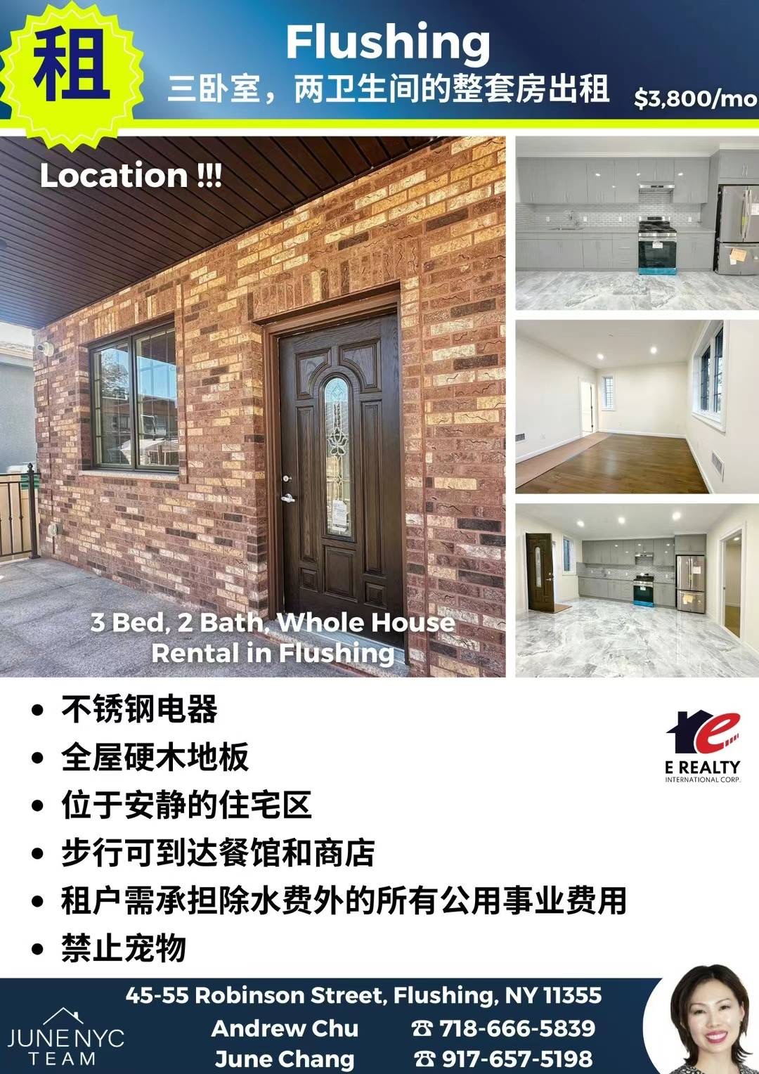 Flushing纽约法拉盛租房 Flushing NY House for rent新上市法拉盛租赁💎全新装修,三房两二浴🔑租