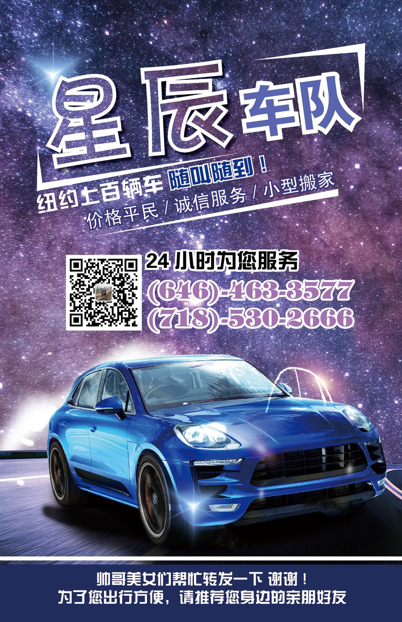 星辰车队:纽约上百辆车随叫随到!24小时为您服务。价格平民、诚信服务、小型搬家。出行热线:6464633577。718530266。帅哥美女们帮忙转发一下谢谢为了您出行方便,请推荐您身边的亲朋好友