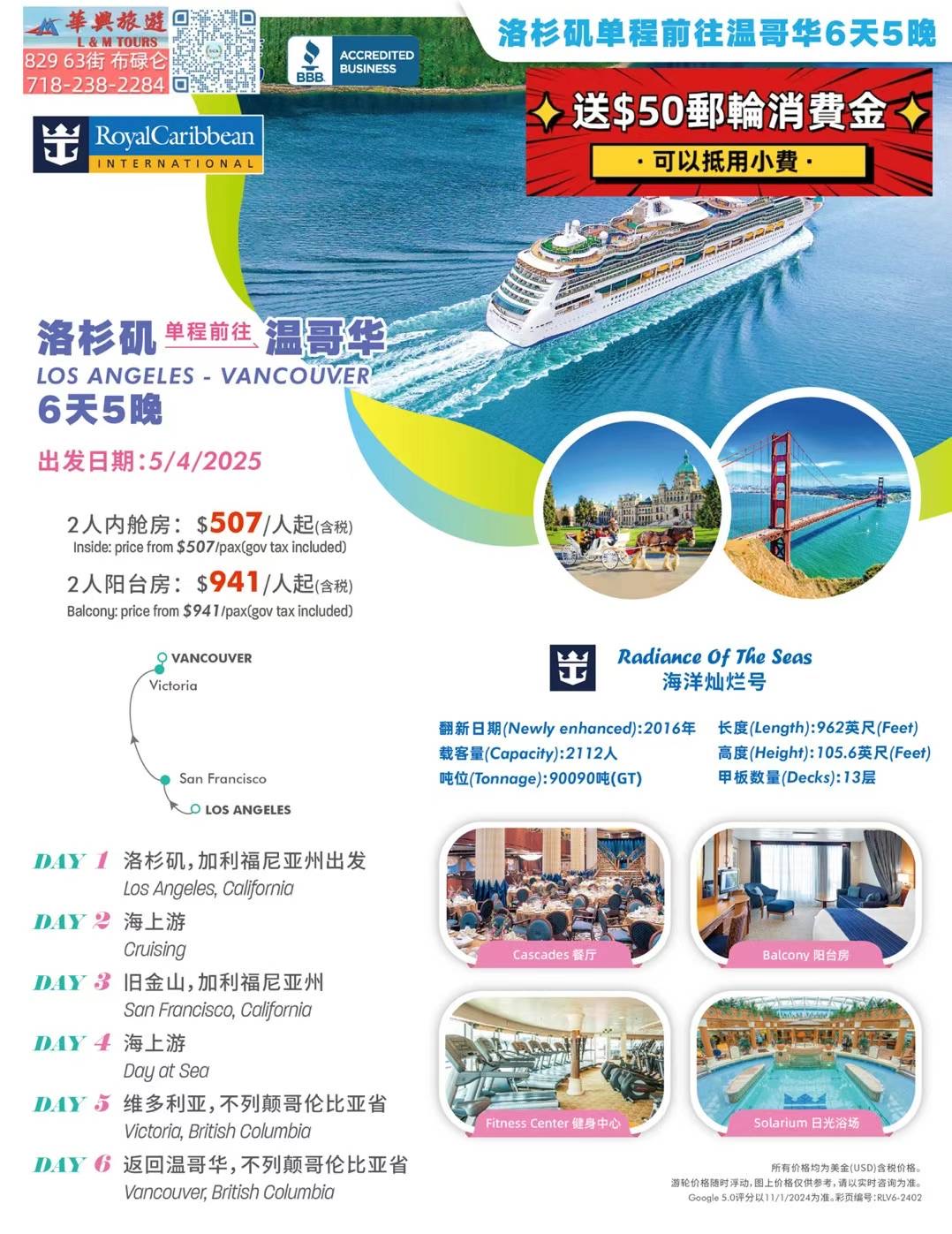 ⛳【洛杉矶 单程前往 温哥华】6天5晚🚢90090吨海洋灿烂号Radiance of the Seas执航~