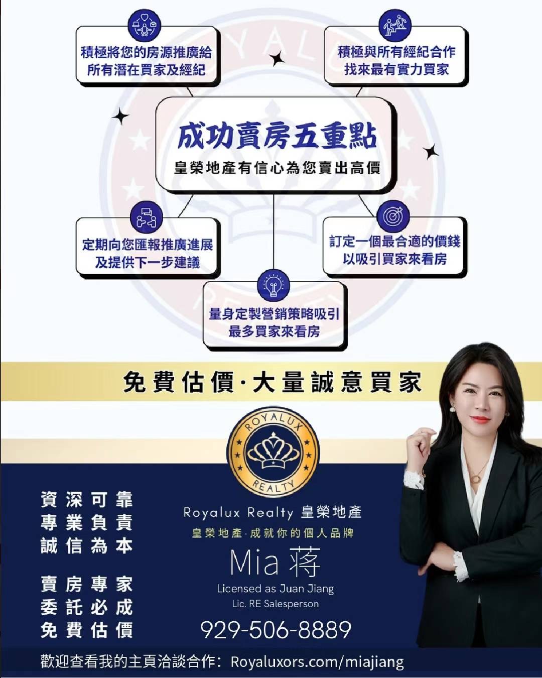 法拉盛华人房地产公司 纽约高端经验房地产经纪 The Best Real Estate Agent in New York 纽约地产经纪最佳地产经纪人您是否在考虑卖房呢?身为一个资深的卖房经纪,只要您聘用我帮您卖房,我有绝对的信心以我专业的卖房五重点,能够帮您卖最高的价钱,欢迎联系我帮您做免费的房屋估价!您的专属地产顾问师,助您达成所有房地产需求谢谢您的信任,房地产买卖投资都欢迎您的委托欢迎查看我的个人主页洽谈合作: Royaluxors.com/miajiang