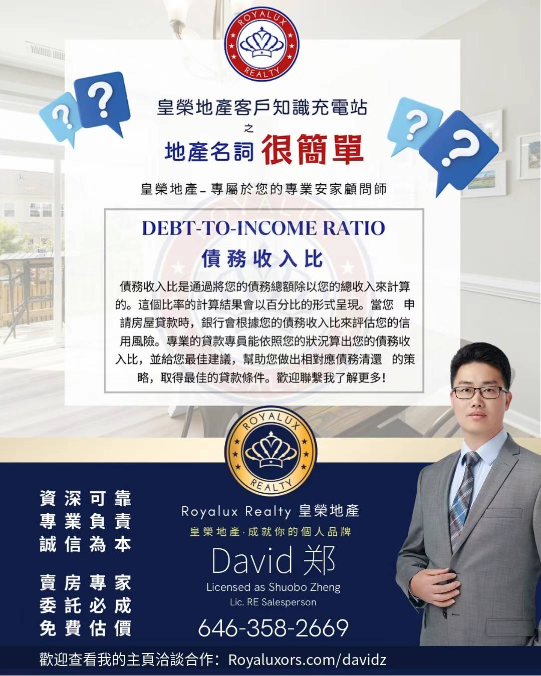 法拉盛华人房地产公司 纽约高端经验房地产经纪 The Best Real Estate Agent in New York 纽约地产经纪最佳地产经纪人作为买家,DTI比例是您的贷款专员用来评估您的可贷款金额及月供的重要依据。皇荣地产提醒您联系贷款专员了解DTI对您申请贷款的具体影响~