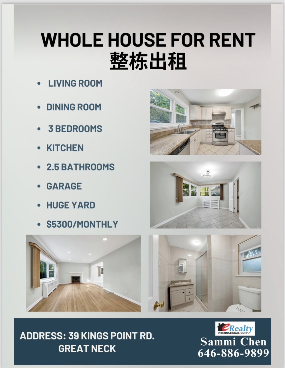 Great Neck 纽约大颈房子出租Great Neck NY House For Rent新上市大颈房屋出租WHOLE HOUSE FOR RENT
