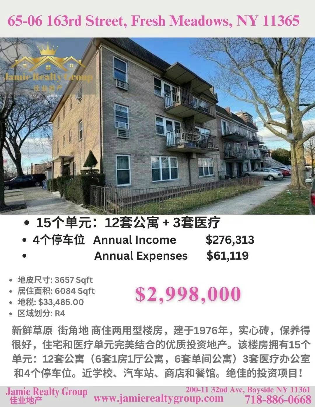 新鲜草原 街角地 商住两用型楼房,建于1976年,实心砖,保养得很好,住宅和医疗单元完美结合的优质投资地产。该楼房拥有15个单元:12套公寓(6套1房1厅公寓,6套单间公寓)3套医疗办公室和4个停车位。近学校、汽车站、商店和餐馆。绝佳的投资项目1976年建,地税$33485使用面积6084尺,开价$298万Jamie 718-309-2982
