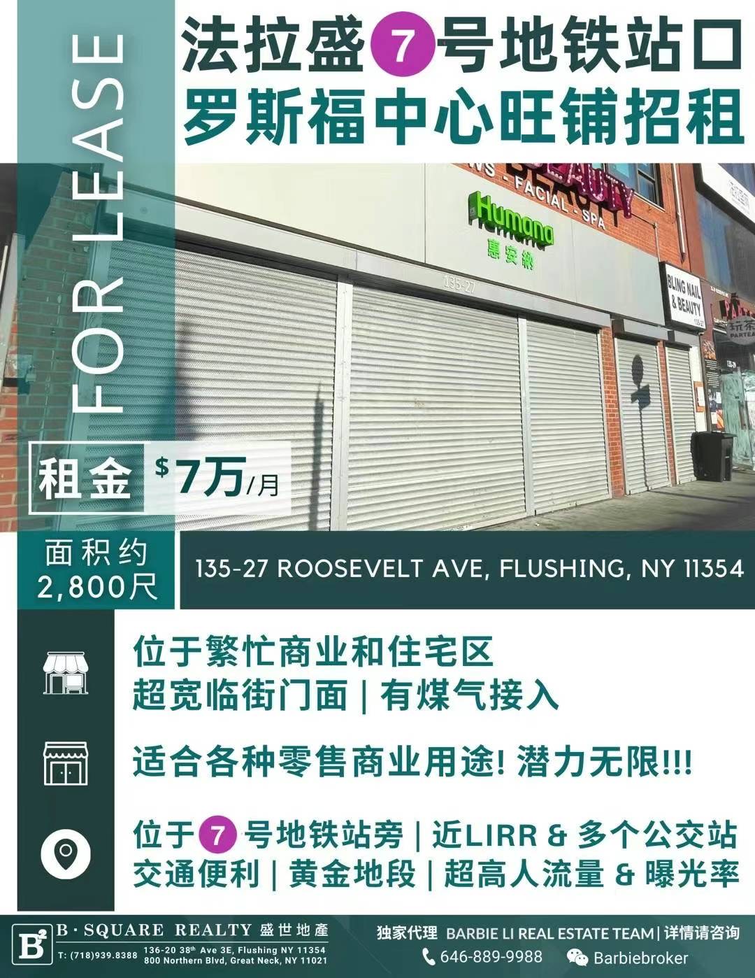 法拉盛➐号地铁站口罗斯福中心旺铺招租ALHumano BLING NA 惠安徽 &BEAUTY 租金7万/月面积约2,800尺135-27 ROOSEVELT AVE, FLUSHING,NY 11354